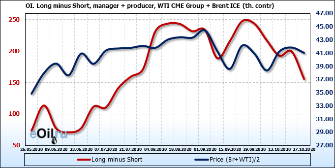 За прошлую неделю, 21.10.20 — 27.10.20, разница между длинными и короткими позициями управляющих упала на 36 тыс. контрактов. В тоже время, цена упала на 0.8 доллара. Наращивание коротких позиций спекулянтами приводит к падению цен. Если давление со стороны медведей продолжится, то мы можем увидеть новые минимумы.