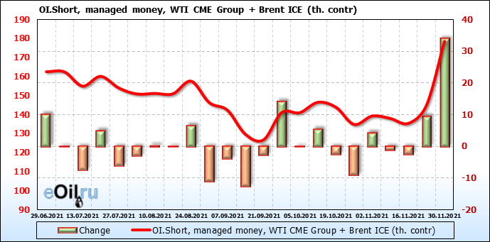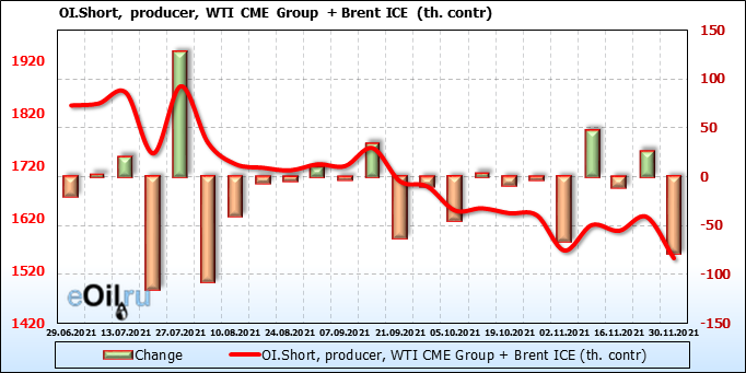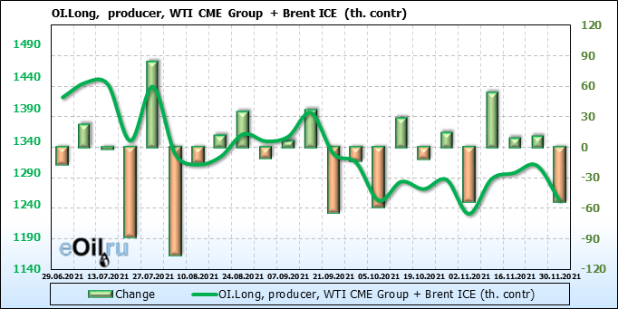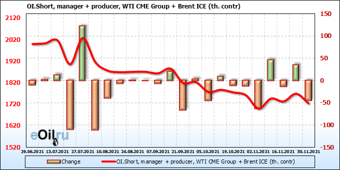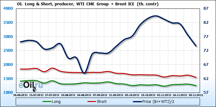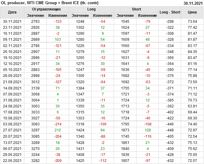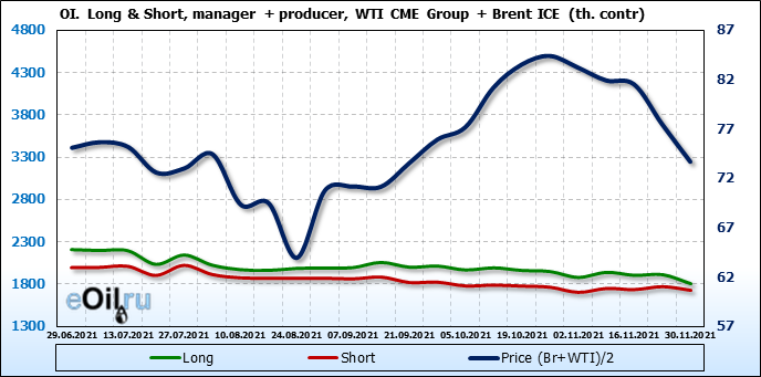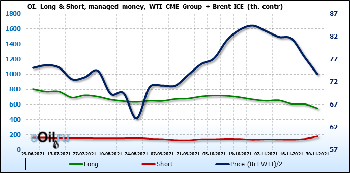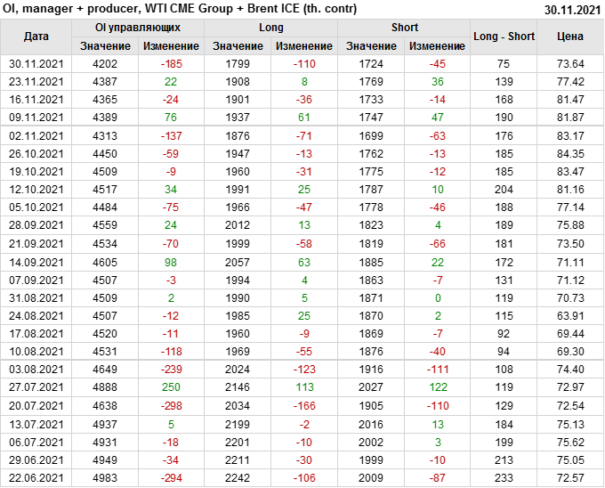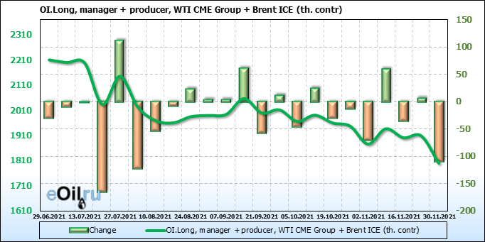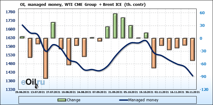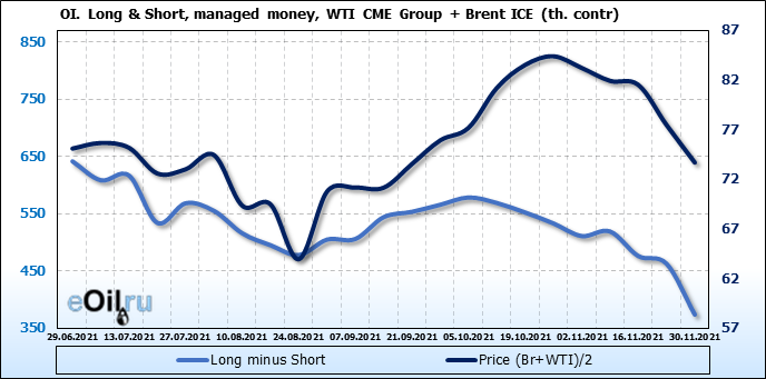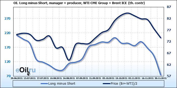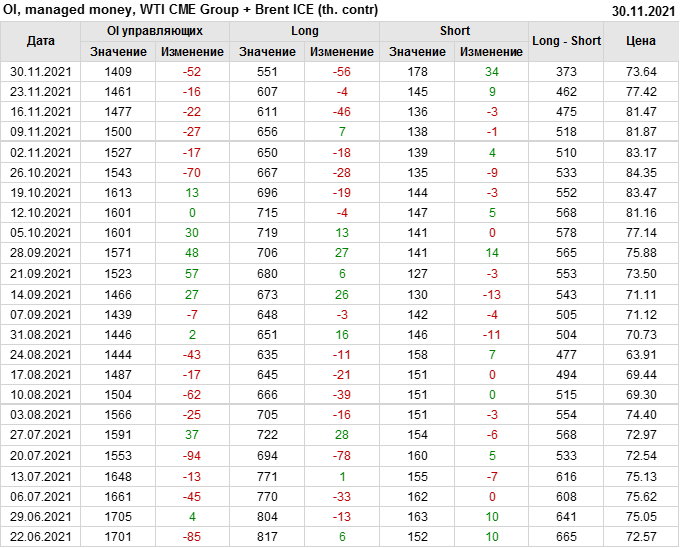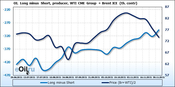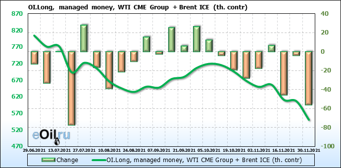За прошлую неделю, 24.11.21 — 30.11.21, разница между длинными и короткими позициями управляющих сократилась на 89.3 тыс. контрактов. В тоже время, цена упала на 3.78 доллара.