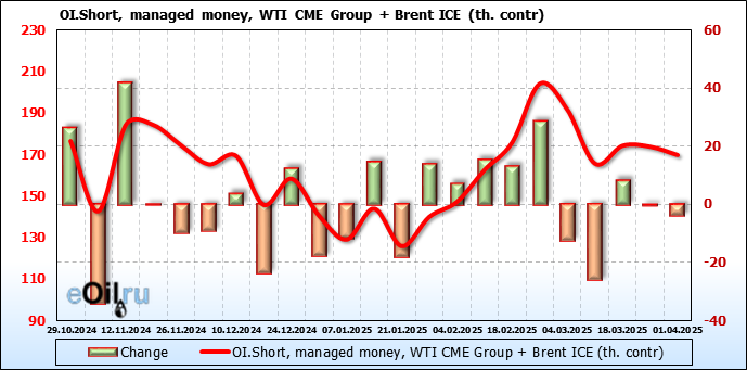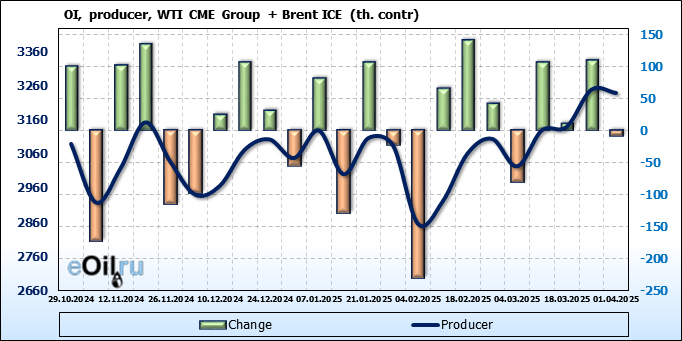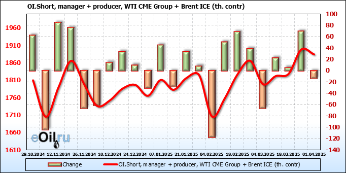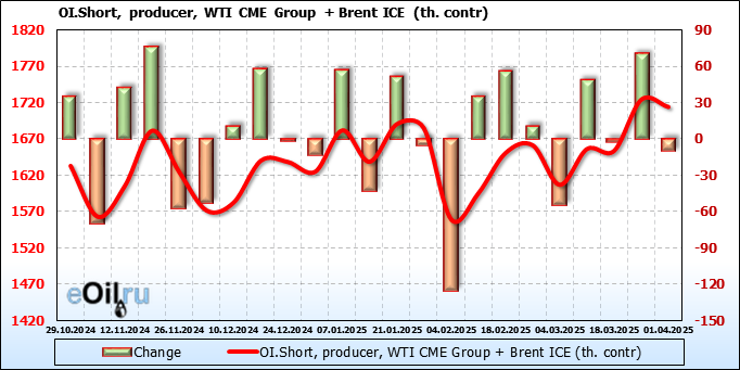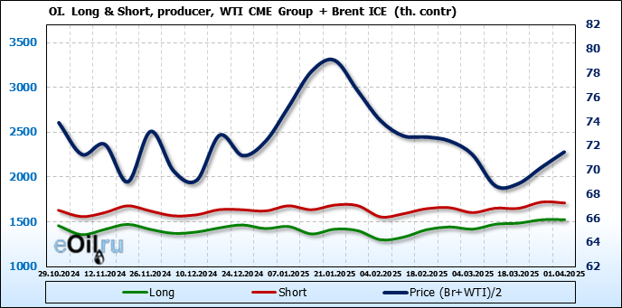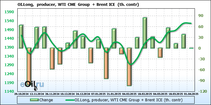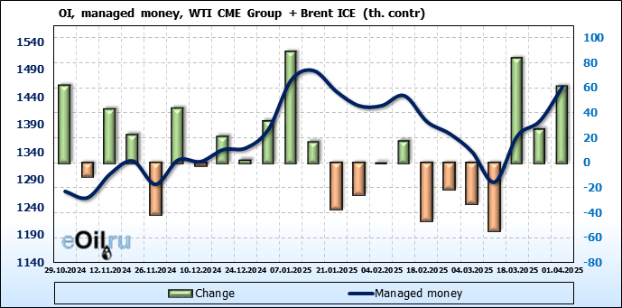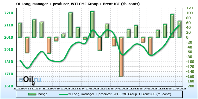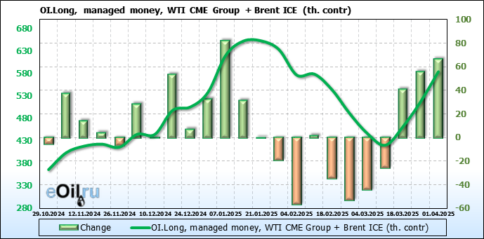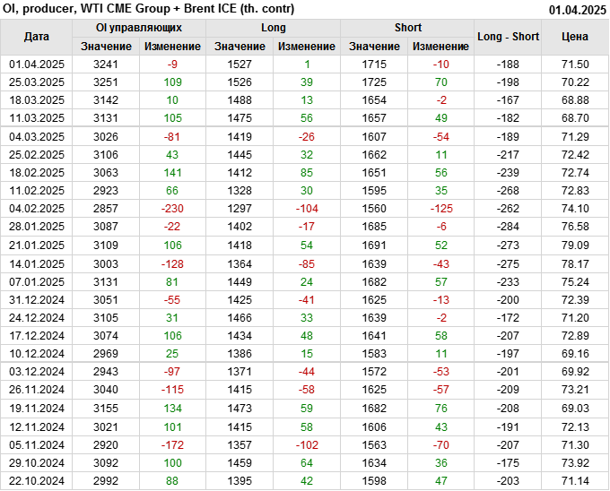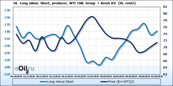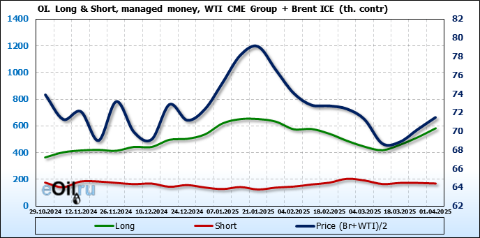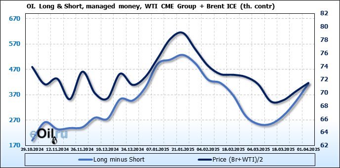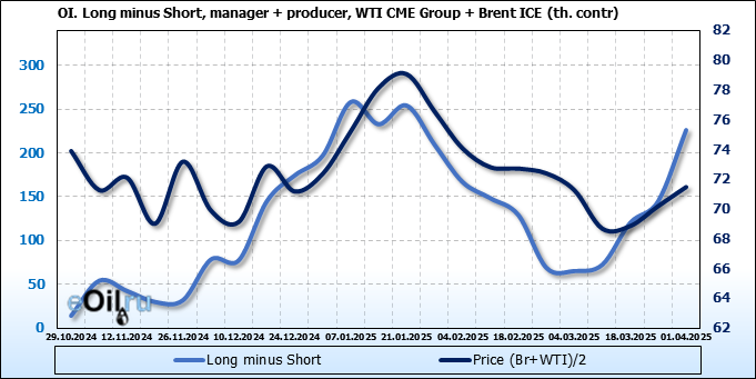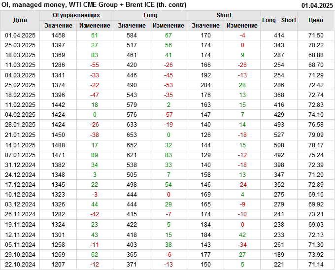 За прошедшую неделю, 26.03.25 — 01.04.25, разница между длинными и короткими позициями управляющих увеличилась на 70.7 тыс. контрактов. В тоже время, цена выросла на 1.28 доллара.