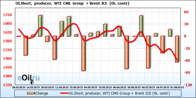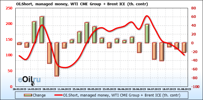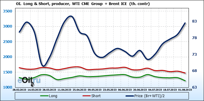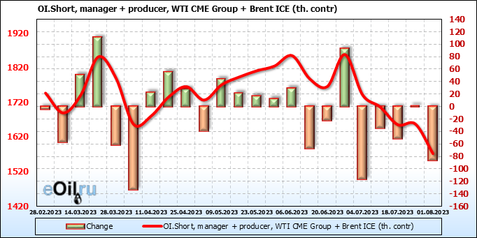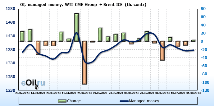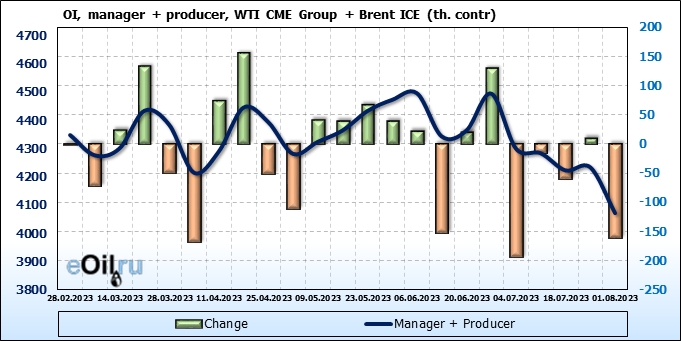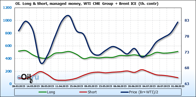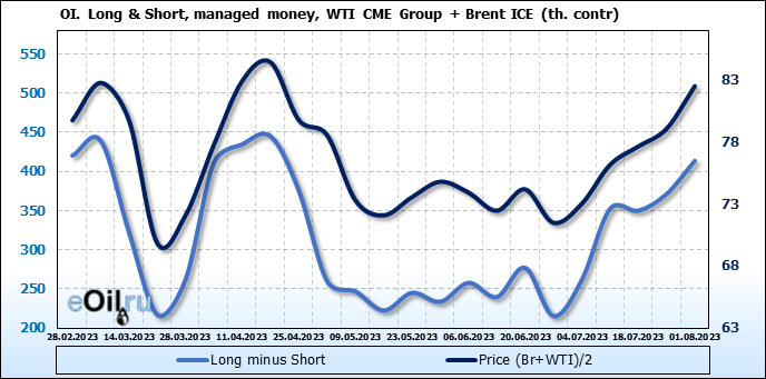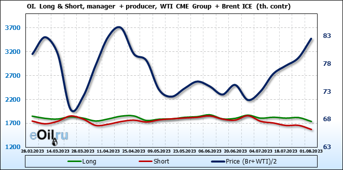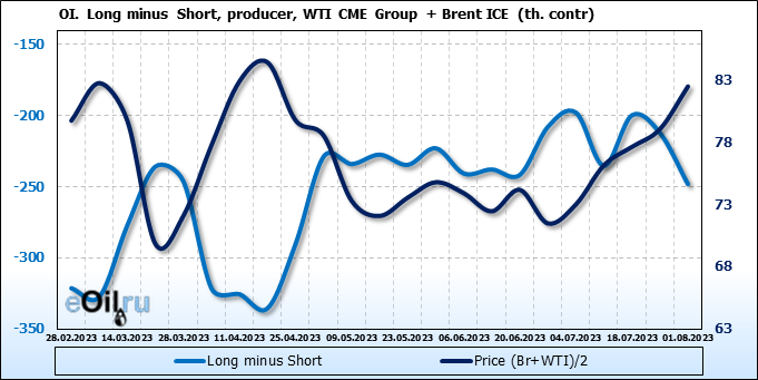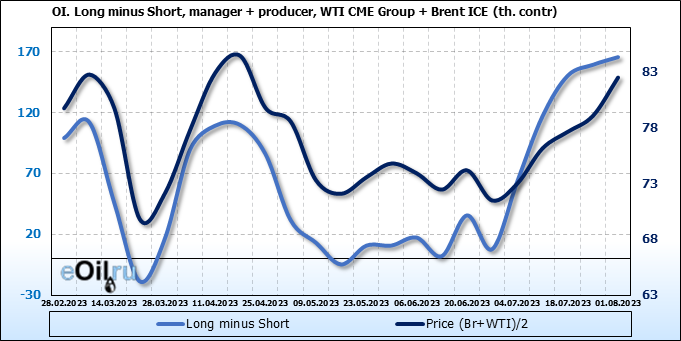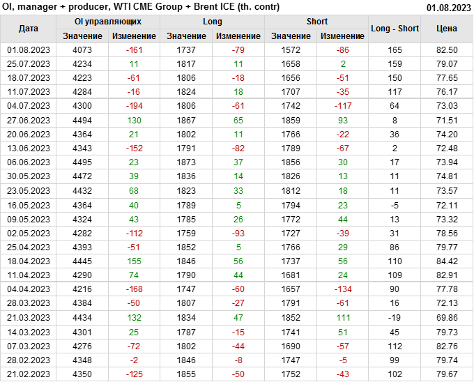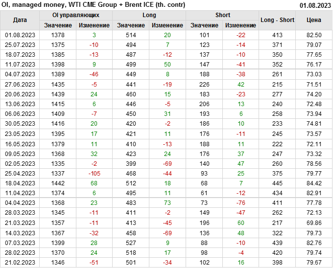 За прошедшую неделю, 26.07.23 — 01.08.23, разница между длинными и короткими позициями управляющих увеличилась на 42.3 тыс. контрактов. В тоже время, цена выросла на 3.43 доллара.