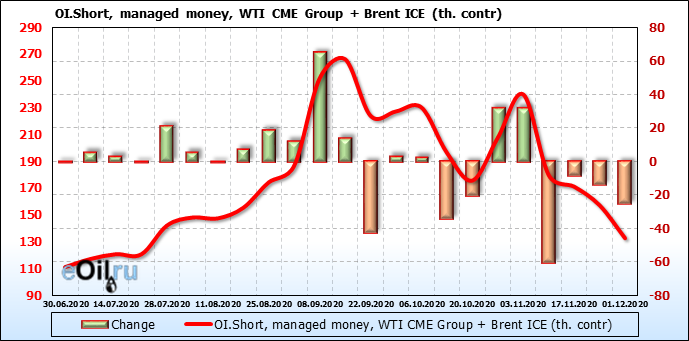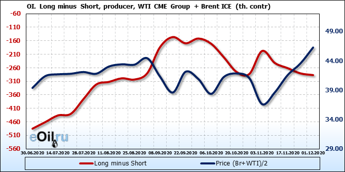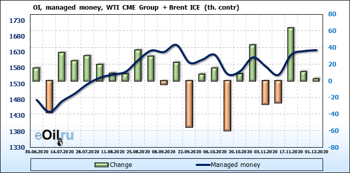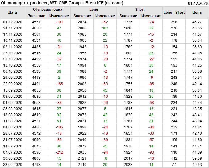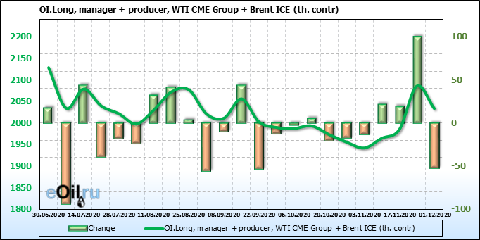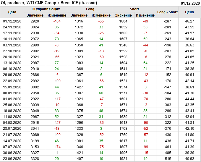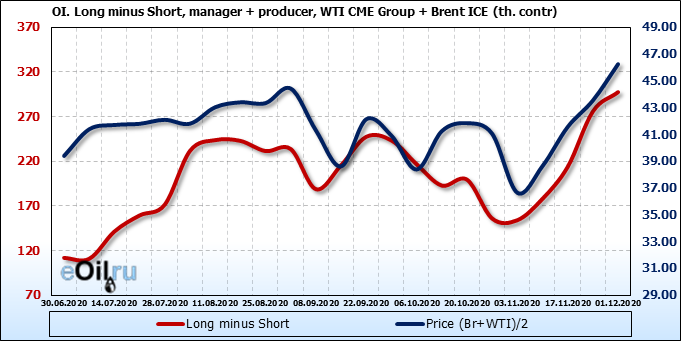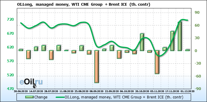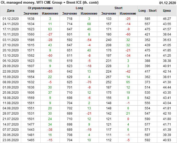 За прошлую неделю, 25.11.20 — 01.12.20, разница между длинными и короткими позициями управляющих выросла на 28 тыс. контрактов. В тоже время, цена выросла на 2.72 доллара. Управляющие наращивают позиции, разгоняя тем самым рост цен, что говорит нам о текущей силе рынка.