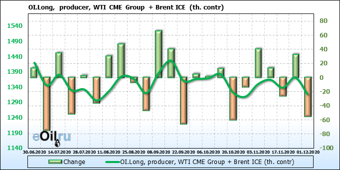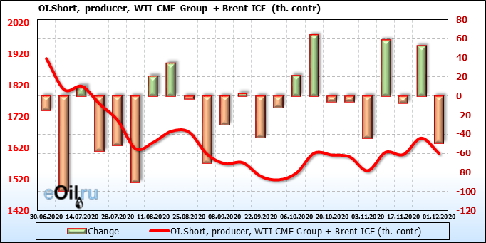 За прошлую неделю, 25.11.20 — 01.12.20, разница между длинными и короткими позициями производителей упала на 6 тыс. контрактов. В тоже время, цена выросла на 2.72 доллара. Производители увеличивают продажи, предполагая, что текущие уровни являются привлекательными для них. И не смотря на это, рынок продолжает расти, что показывает силу текущего тренда.