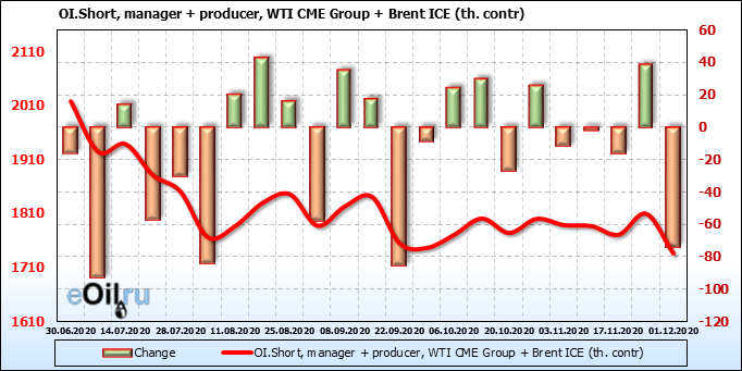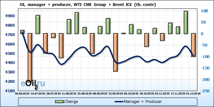 За прошлую неделю, 25.11.20 — 01.12.20, разница между длинными и короткими позициями производителей и управляющих выросла на 22 тыс. контрактов. За отчетный период времени, цена выросла на 2.72 доллара. Совокупно производители и управляющие наращивают длинные позиции, поддерживая рост цен. Это сильная комбинация, которая должна вызывать доверие у всё большего числа быков.