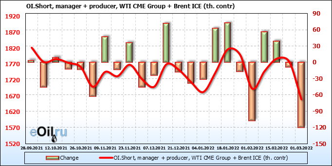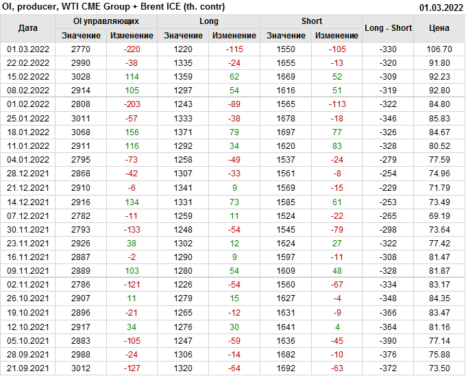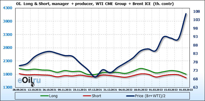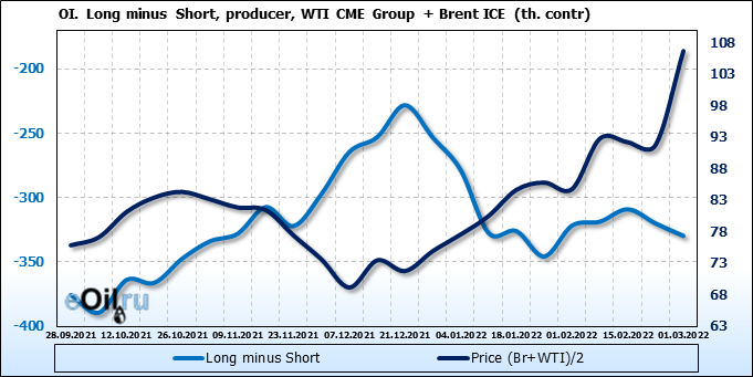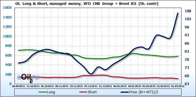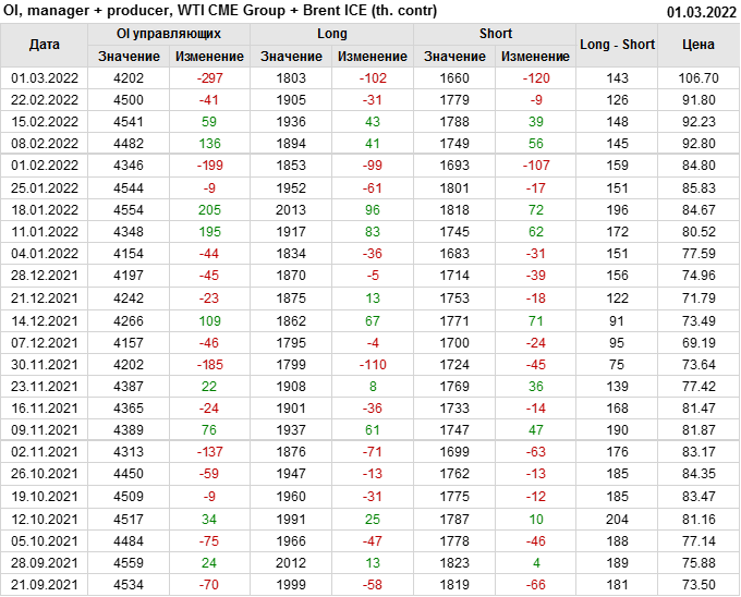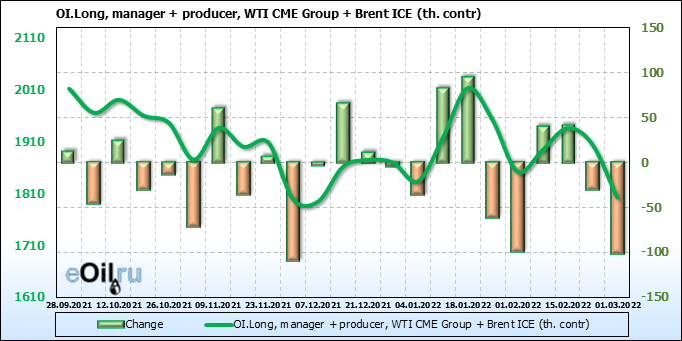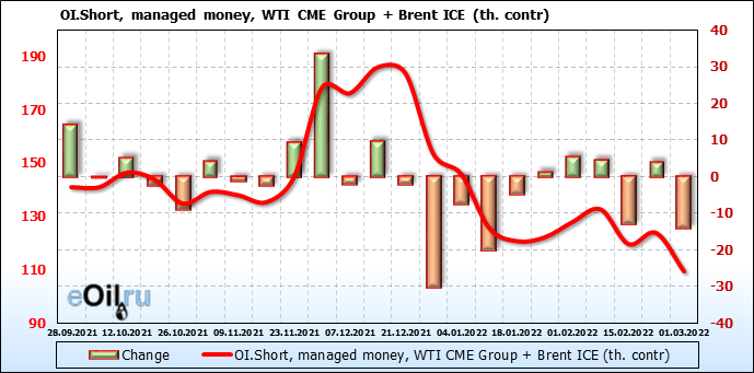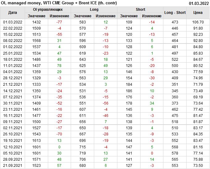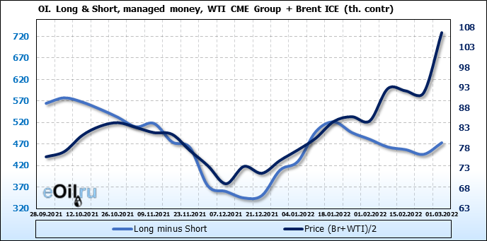 За прошедшую неделю, 23.02.22 — 01.03.22, разница между длинными и короткими позициями управляющих увеличилась на 26.9 тыс. контрактов. В тоже время, цена выросла на 14.9 доллара.