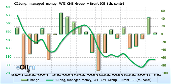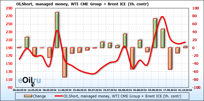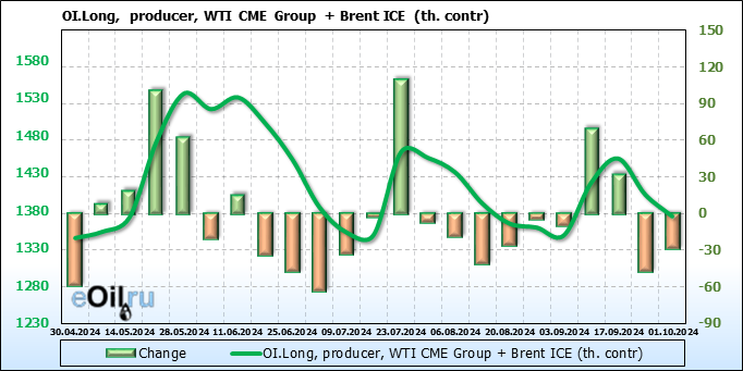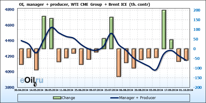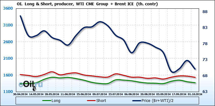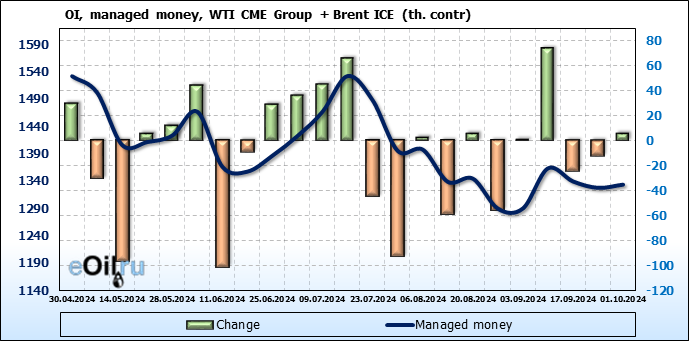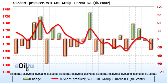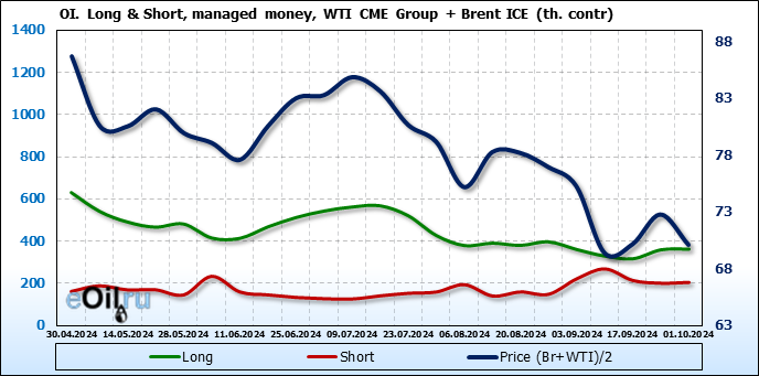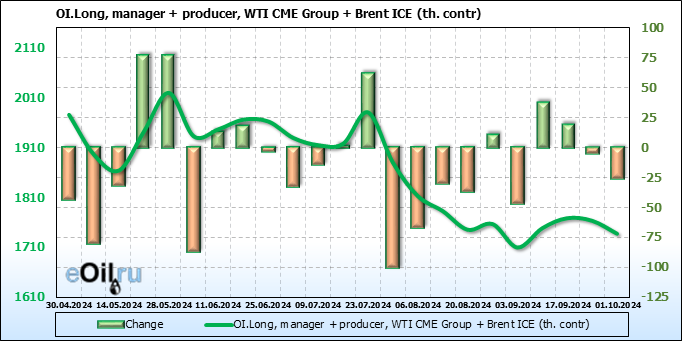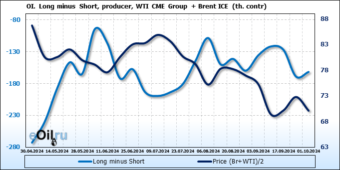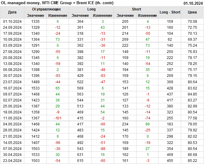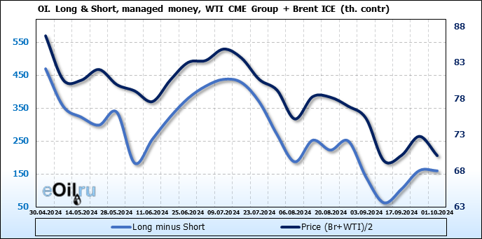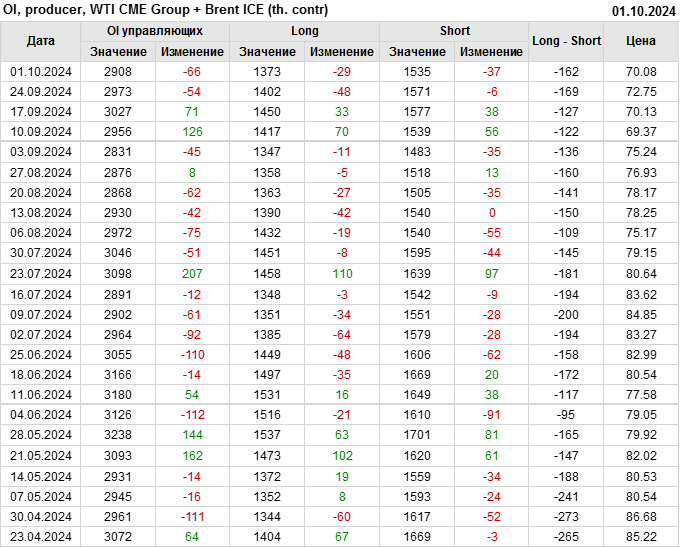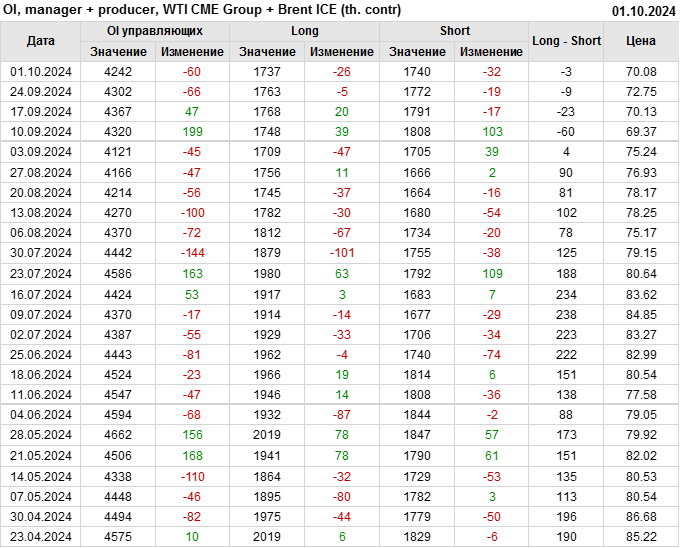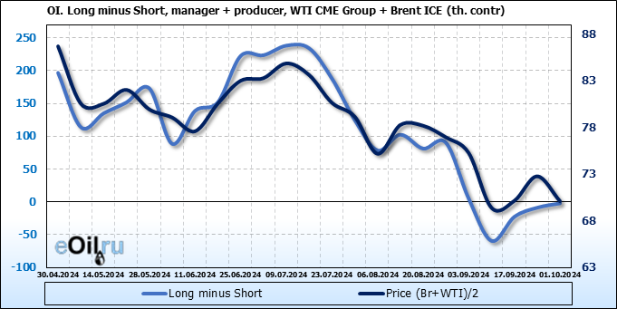За прошедшую неделю, 25.09.24 — 01.10.24, разница между длинными и короткими позициями управляющих сократилась на 0.9 тыс. контрактов. В тоже время, цена упала на 2.67 доллара.