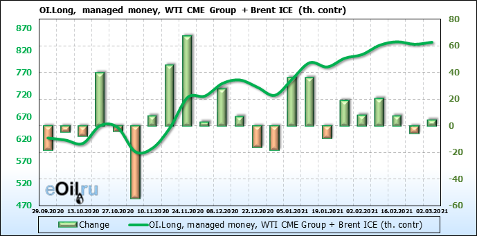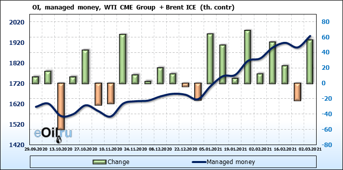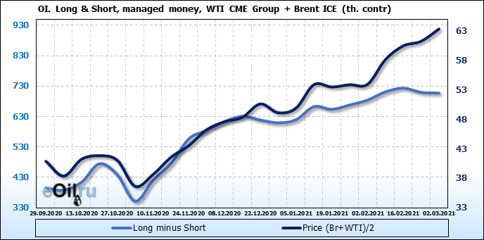 За прошлую неделю, 24.02.21 — 02.03.21, разница между длинными и короткими позициями управляющих упала на 2 тыс. контрактов. В тоже время, цена выросла на 2.09 доллара. Управляющие не горят желанием покупать, что заставляет нас рассуждать о потери доверия к тенденции со стороны быков — спекулянтов. Рынок становится более тонким. Без прихода свежих объемов, толкать цену вверх скоро будет некому.