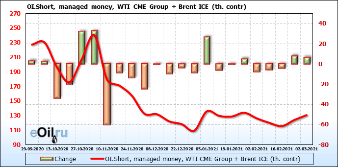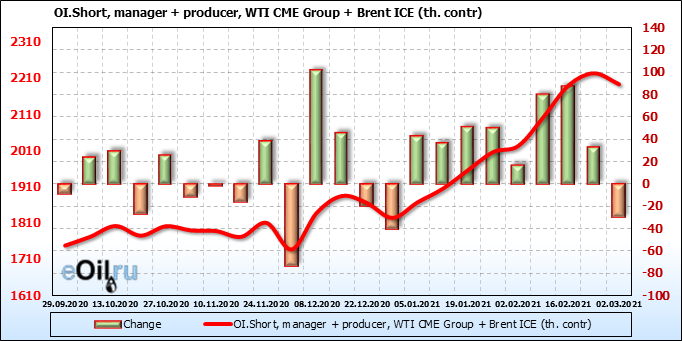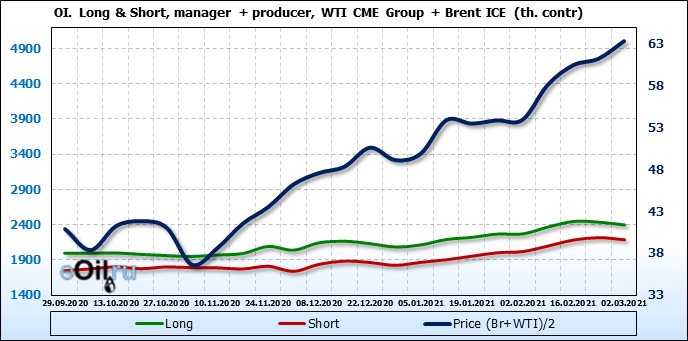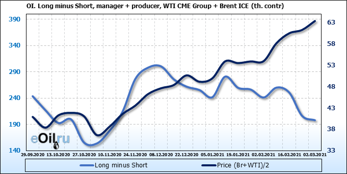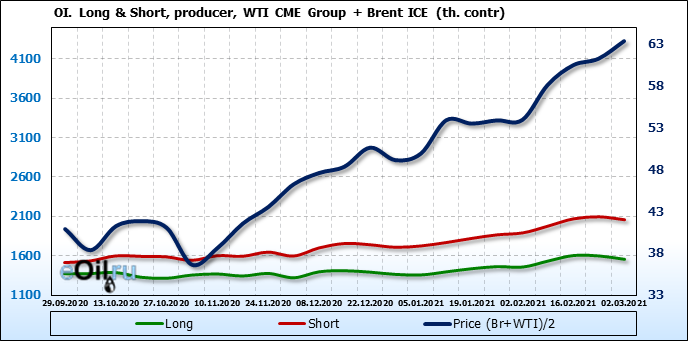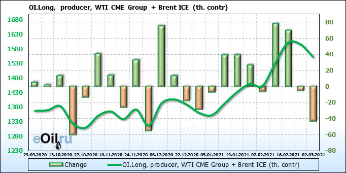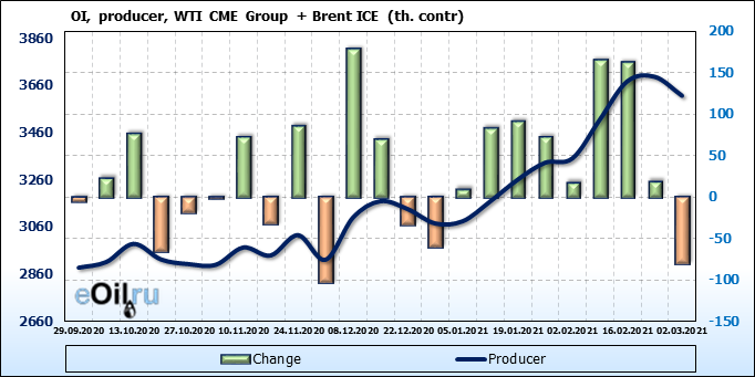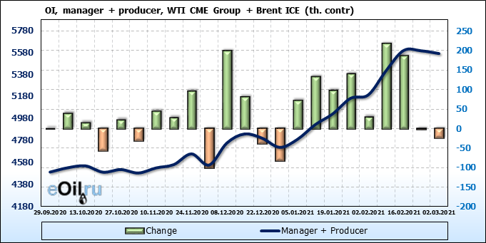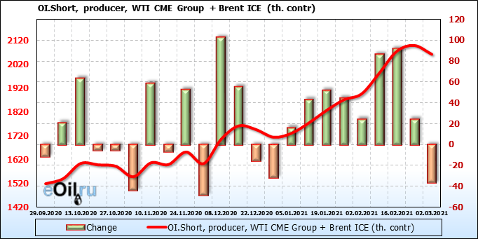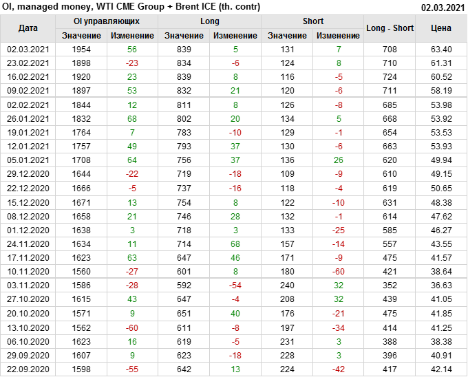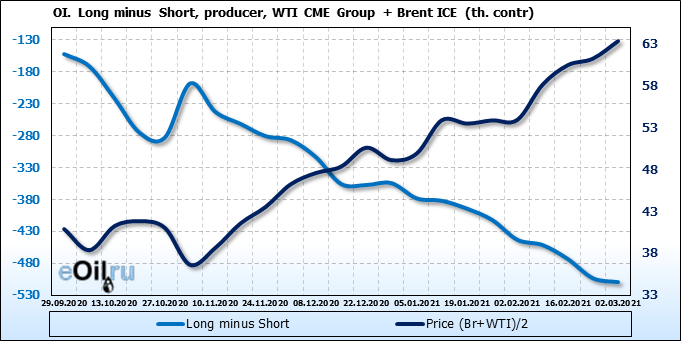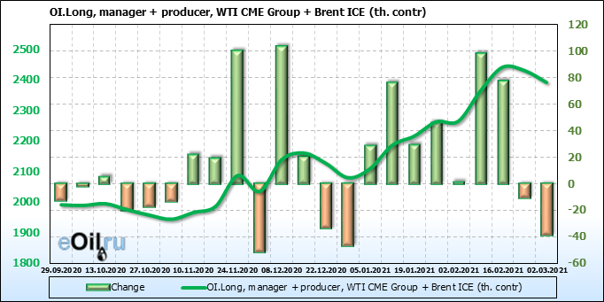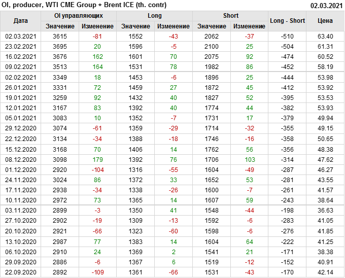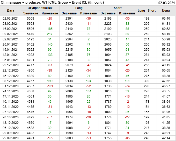 За прошлую неделю, 24.02.21 — 02.03.21, разница между длинными и короткими позициями производителей и управляющих упала на 8 тыс. контрактов. За отчетный период времени, цена выросла на 2.09 доллара. Разница совокупного объема длинных и коротких позиций производителей и управляющих на прошедшей неделе снизилась, в то время как цены выросли. Рынок теряет доверие покупателей, что, при продолжении данной динамики, приведет к стабилизации или падению цен в ближайшее время.