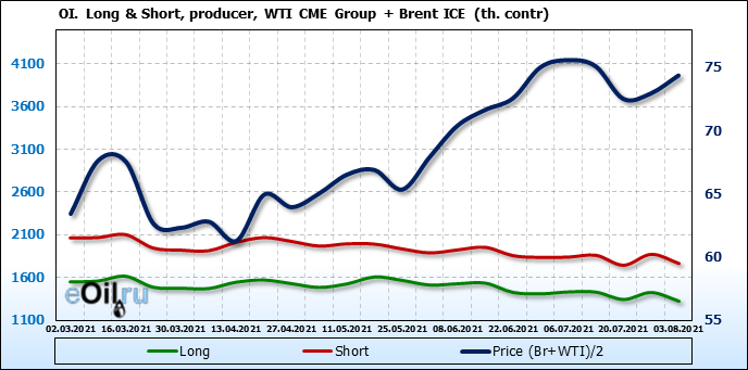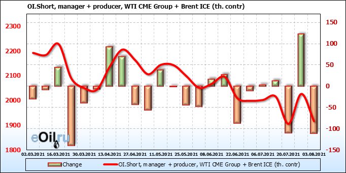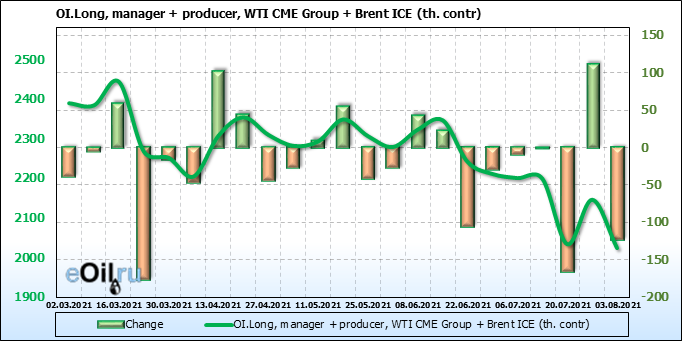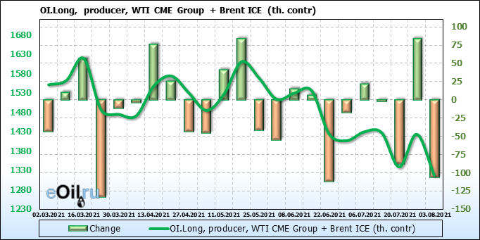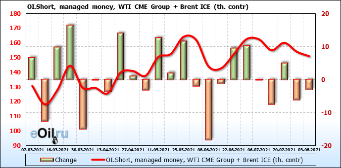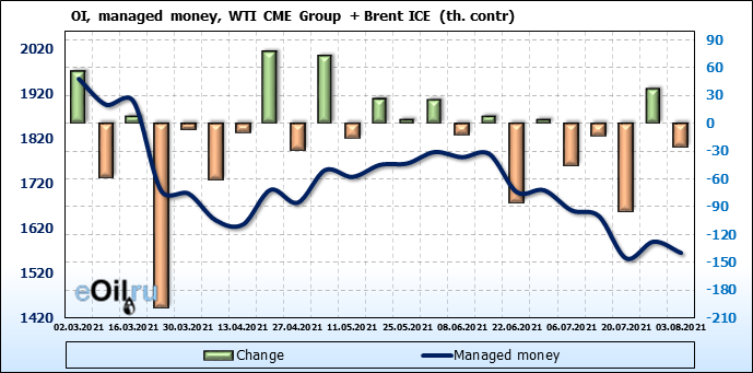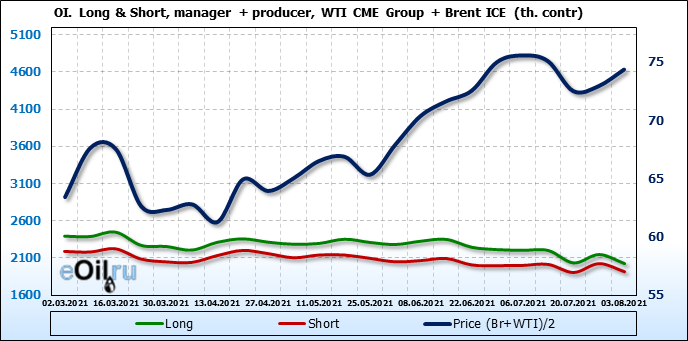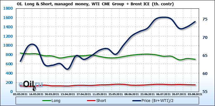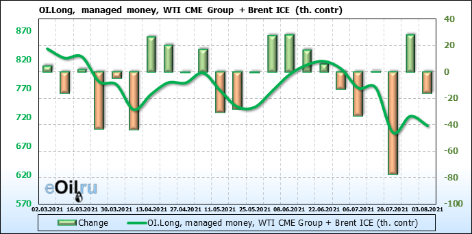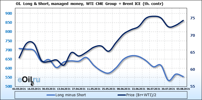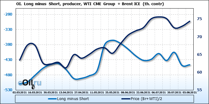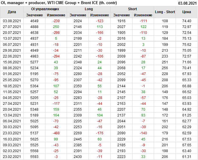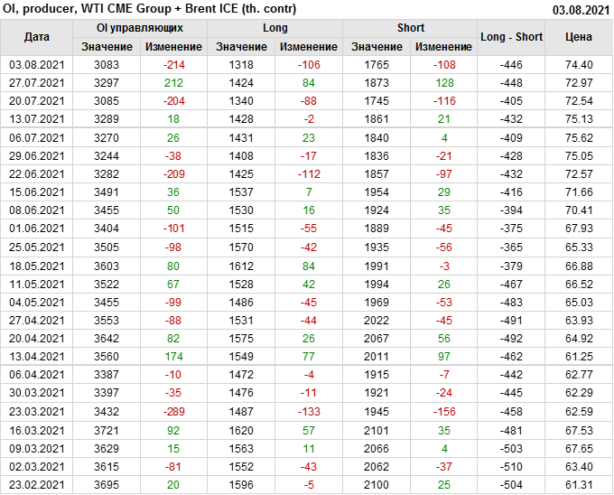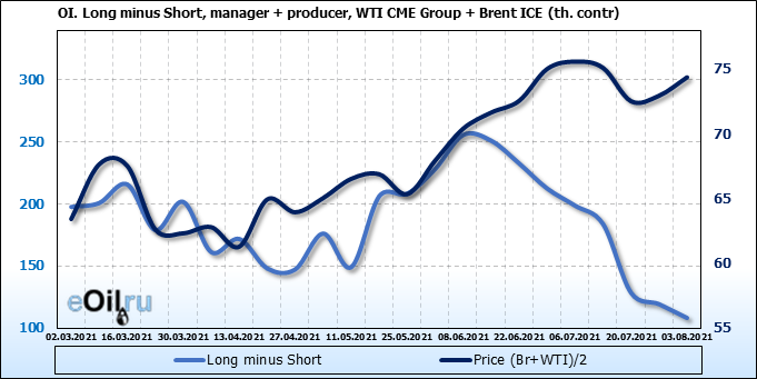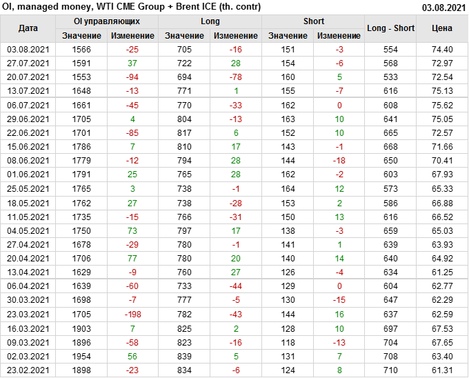 За прошлую неделю, 28.07.21 — 03.08.21, разница между длинными и короткими позициями управляющих сократилась на 13.3 тыс. контрактов. В тоже время, цена выросла на 1.43 доллара.