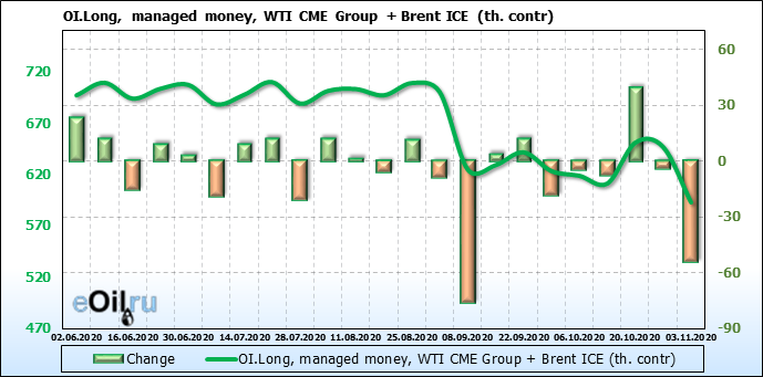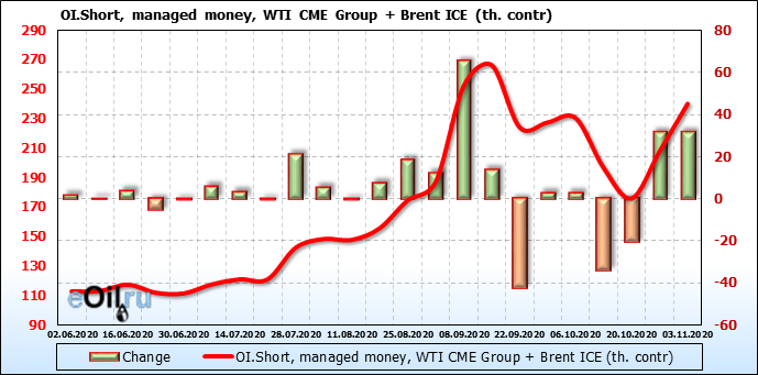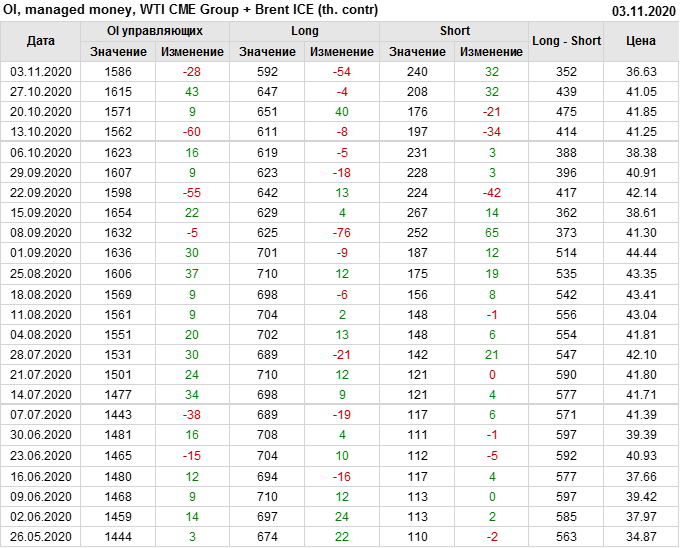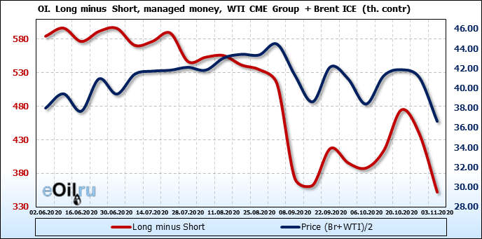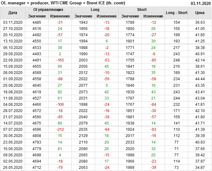 За прошлую неделю, 28.10.20 — 03.11.20, разница между длинными и короткими позициями управляющих упала на 87 тыс. контрактов. В тоже время, цена упала на 4.42 доллара. Наращивание коротких позиций спекулянтами приводит к падению цен. Если давление со стороны медведей продолжится, то мы можем увидеть новые минимумы.