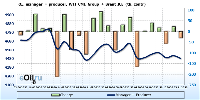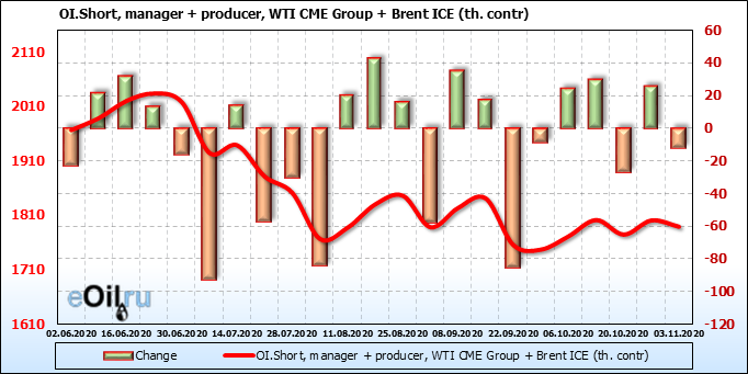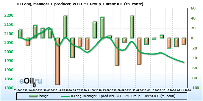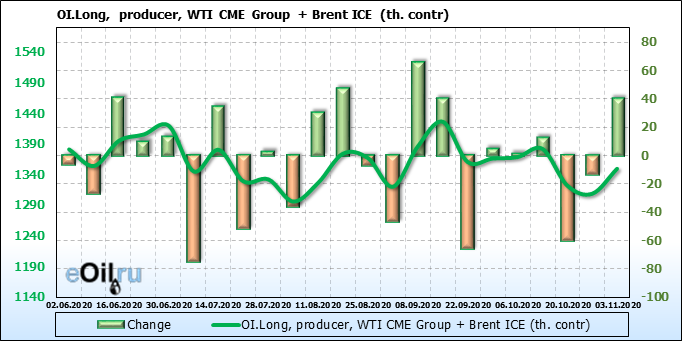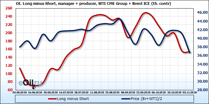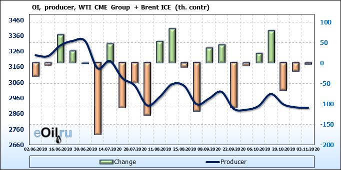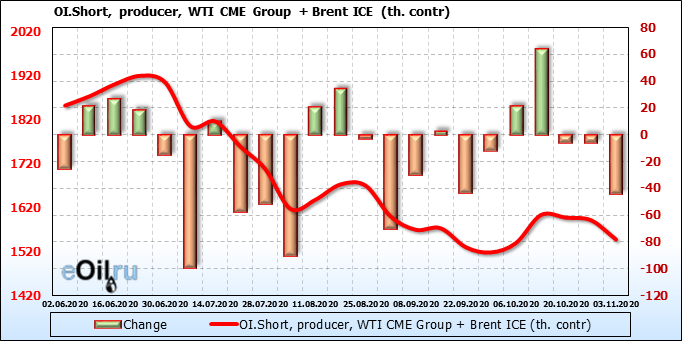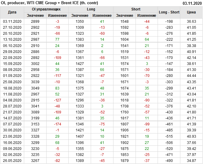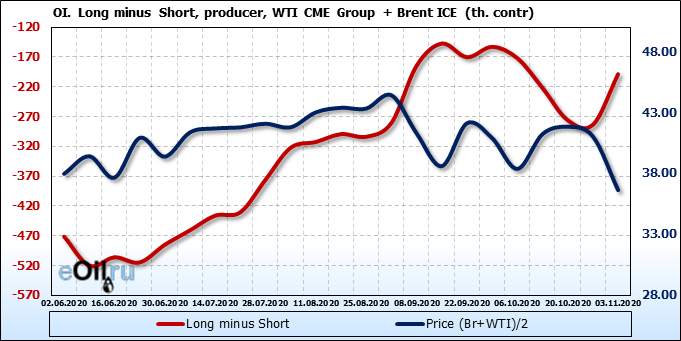 За прошлую неделю, 28.10.20 — 03.11.20, разница между длинными и короткими позициями производителей выросла на 85 тыс. контрактов. В тоже время, цена упала на 4.42 доллара. Производители перестали наращивать короткие позиции, что говорит или о непривлекательности текущих ценовых уровней для хеджирования, или о том, что часть участников рынка заняла выжидательную позицию.