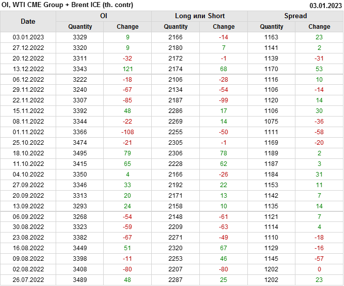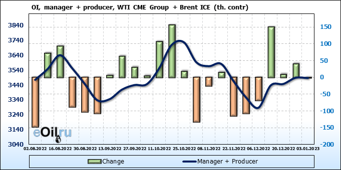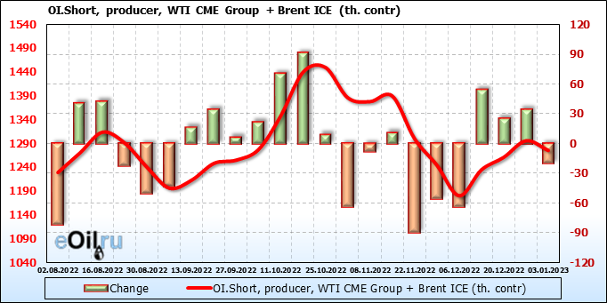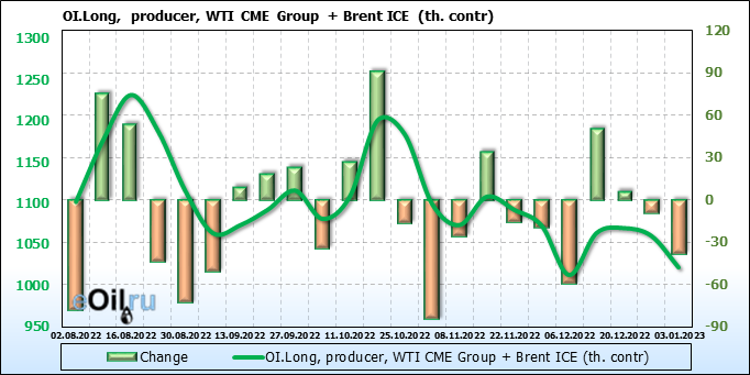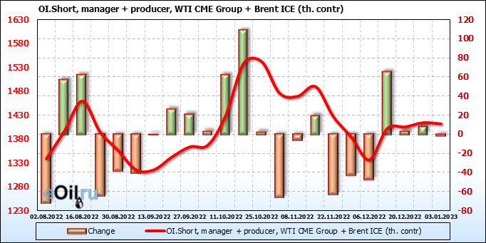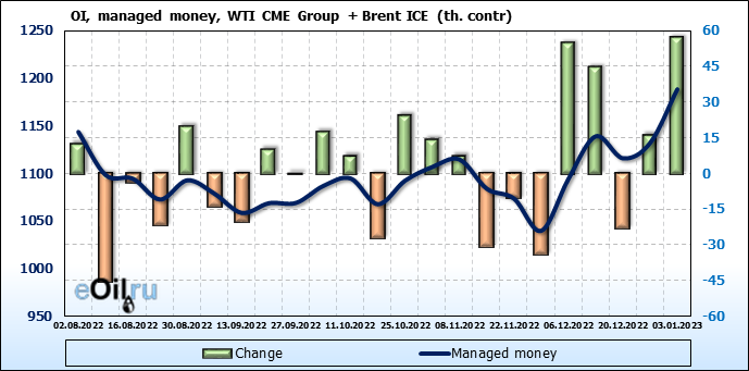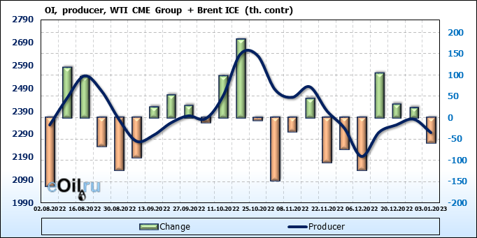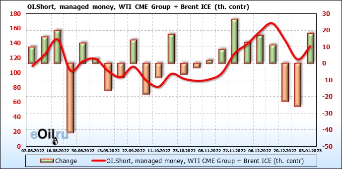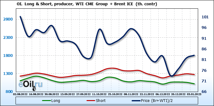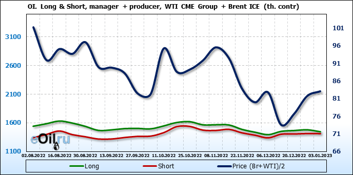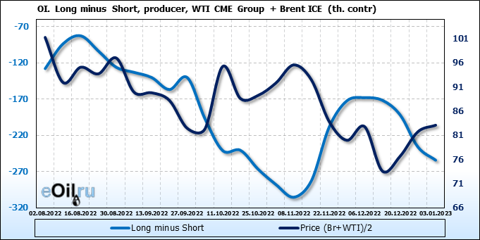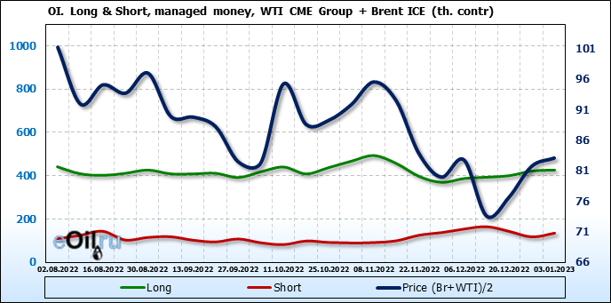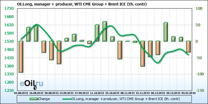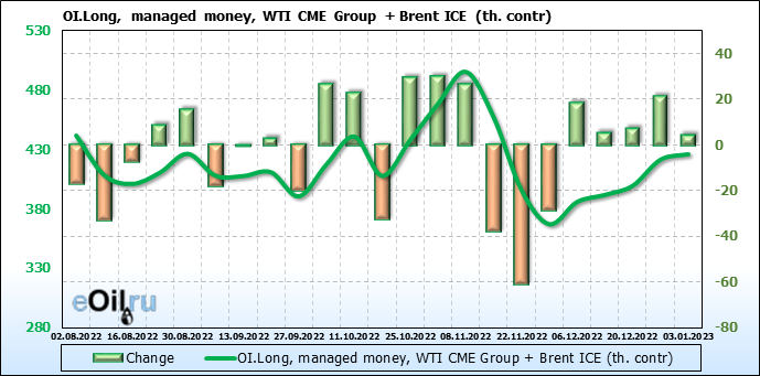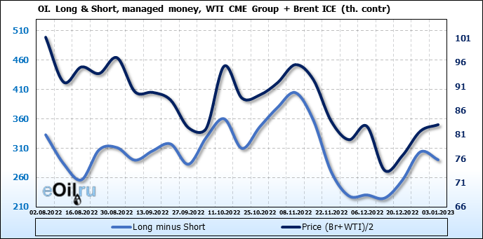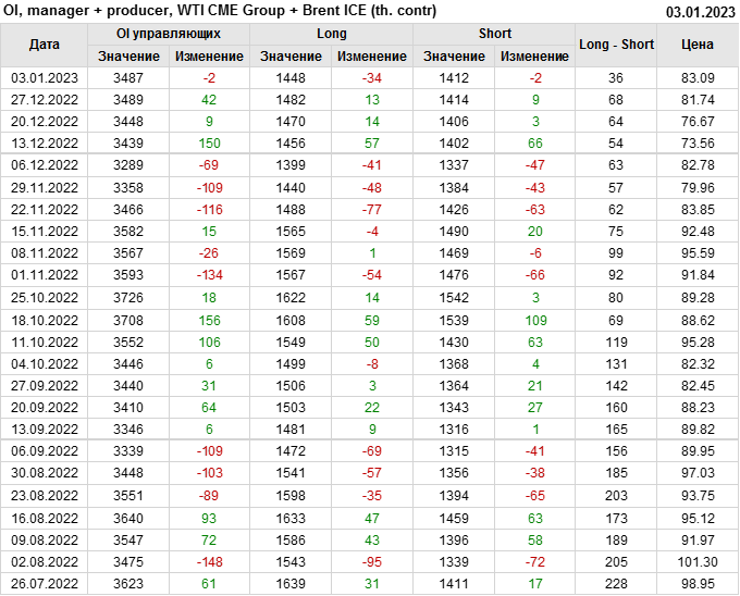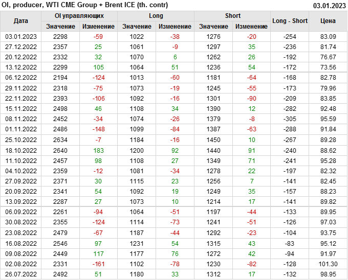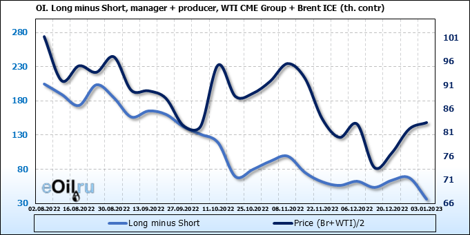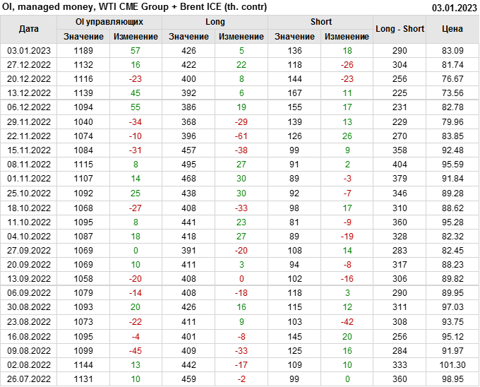 За прошедшую неделю, 28.12.22 — 03.01.23, разница между длинными и короткими позициями управляющих сократилась на 13.4 тыс. контрактов. В тоже время, цена выросла на 1.35 доллара.