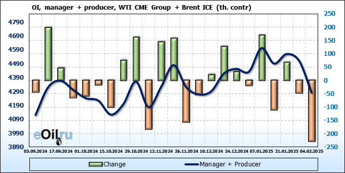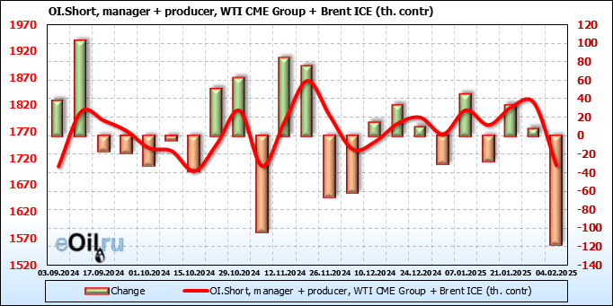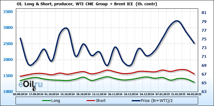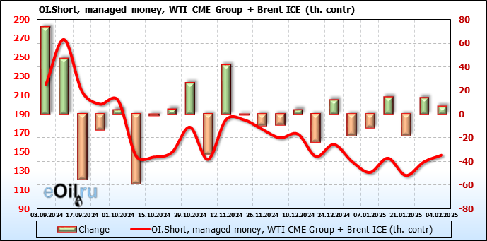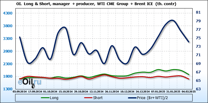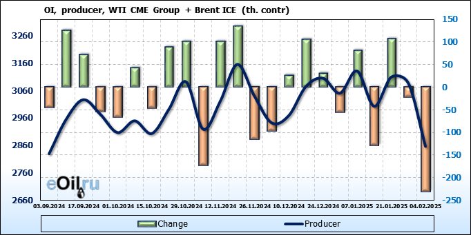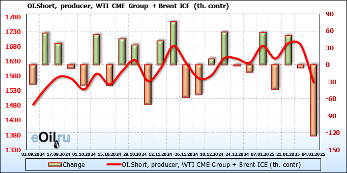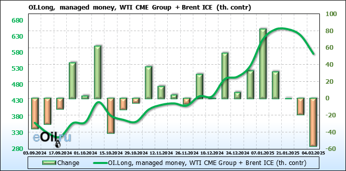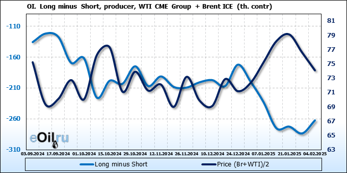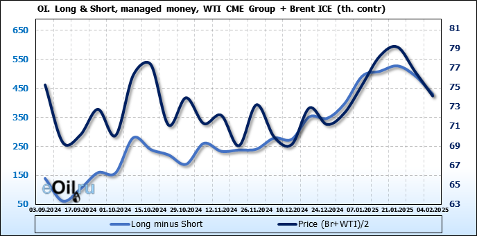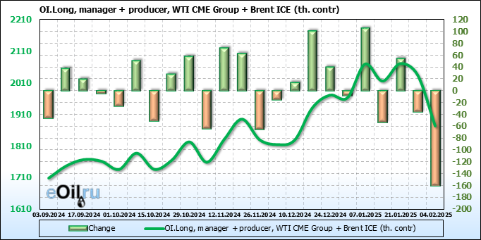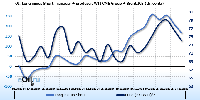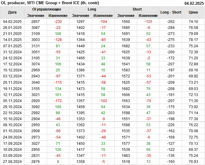 За прошедшую неделю, 29.01.25 — 04.02.25, разница между длинными и короткими позициями управляющих сократилась на 64 тыс. контрактов. В тоже время, цена упала на 2.48 доллара.
