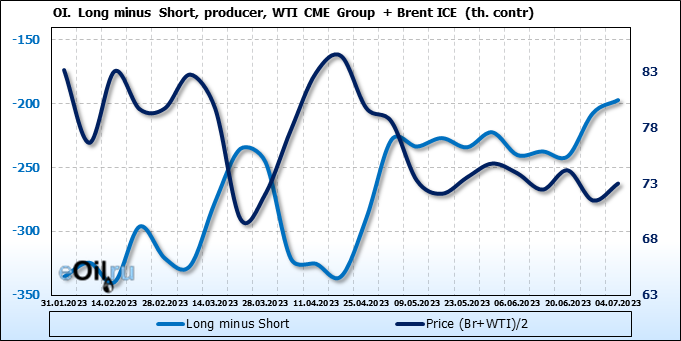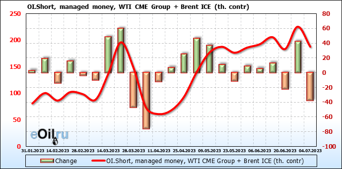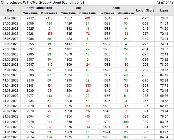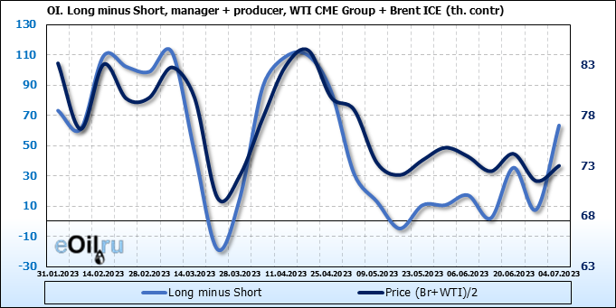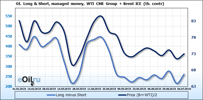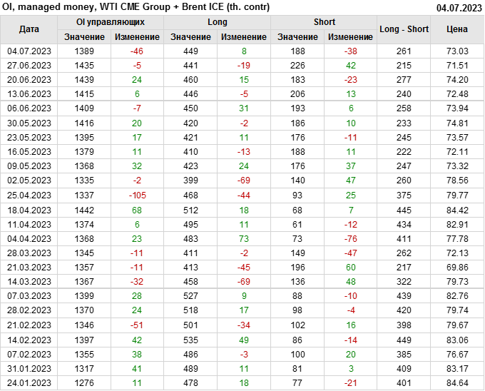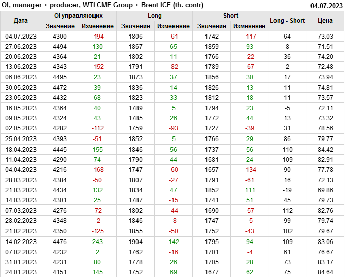 За прошедшую неделю, 28.06.23 — 04.07.23, разница между длинными и короткими позициями управляющих увеличилась на 45.6 тыс. контрактов. В тоже время, цена выросла на 1.52 доллара.
