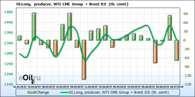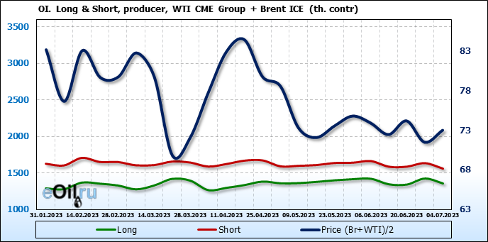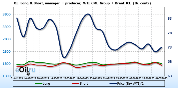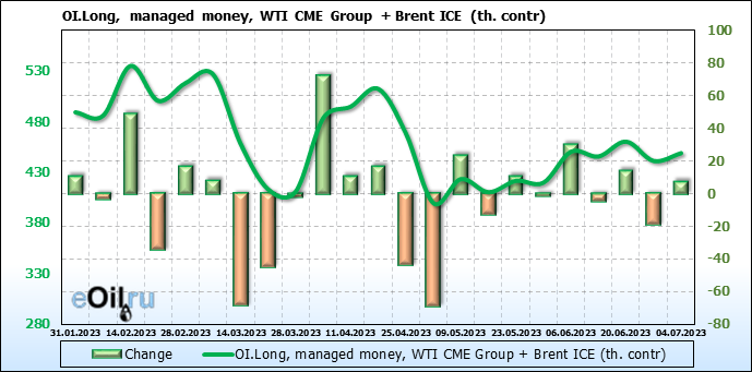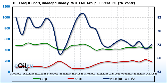 За прошедшую неделю, 28.06.23 — 04.07.23, разница между длинными и короткими позициями управляющих увеличилась на 45.6 тыс. контрактов. В тоже время, цена выросла на 1.52 доллара.