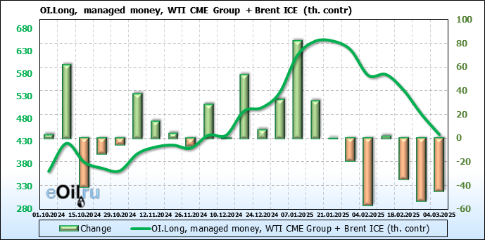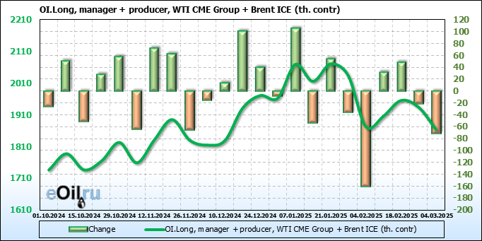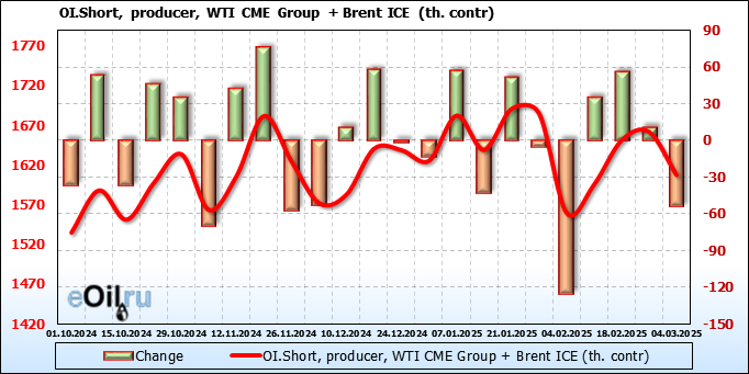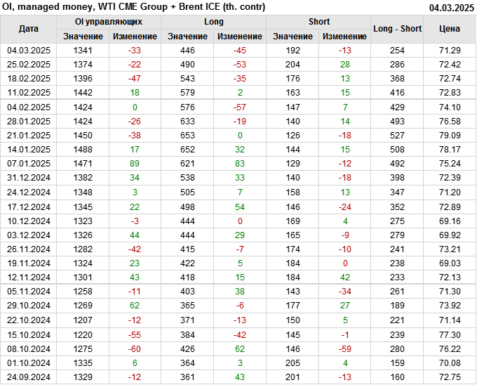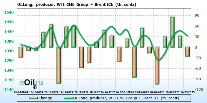 За прошедшую неделю, 26.02.25 — 04.03.25, разница между длинными и короткими позициями управляющих сократилась на 32 тыс. контрактов. В тоже время, цена упала на 1.13 доллара.