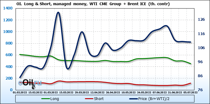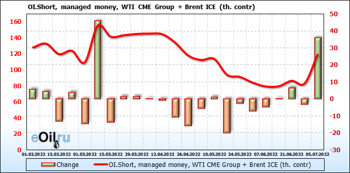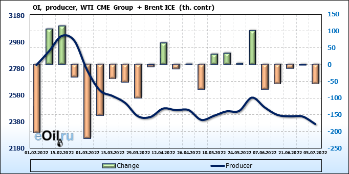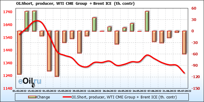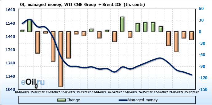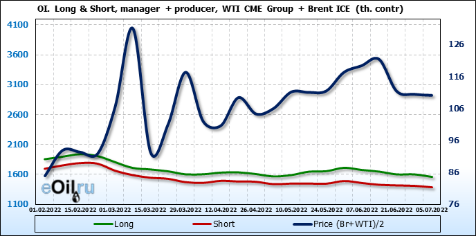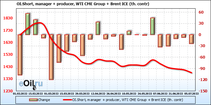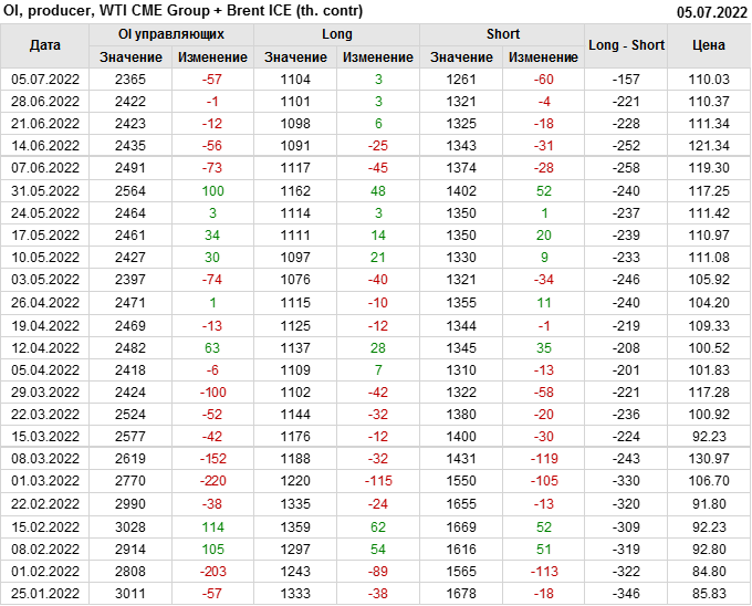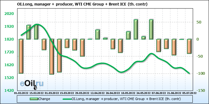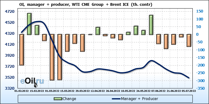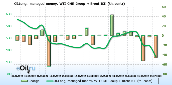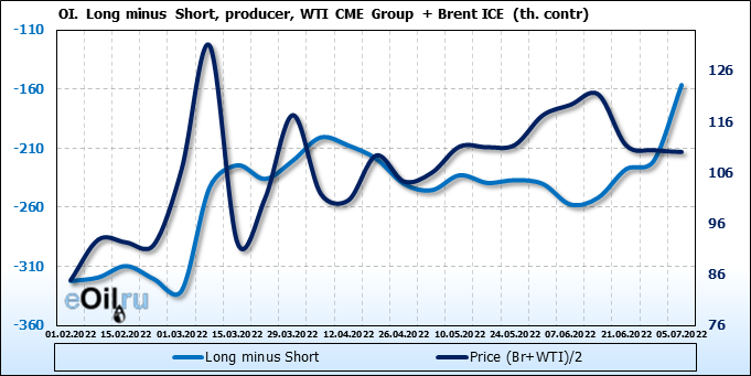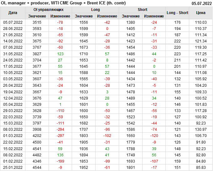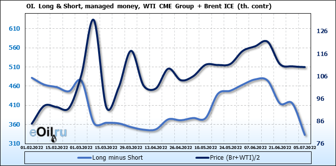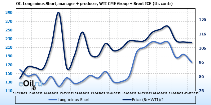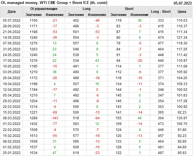 За прошедшую неделю, 29.06.22 — 05.07.22, разница между длинными и короткими позициями управляющих сократилась на 81.7 тыс. контрактов. В тоже время, цена упала на 0.34 доллара.