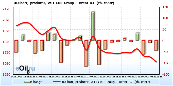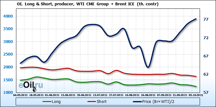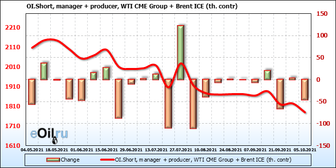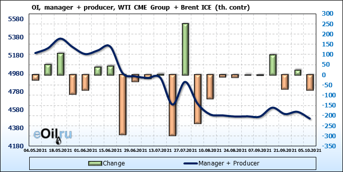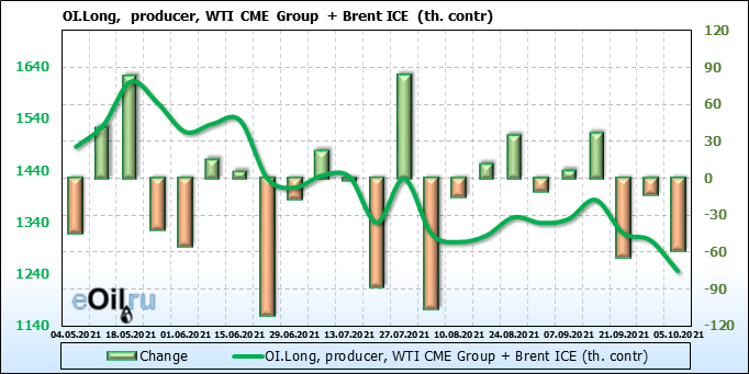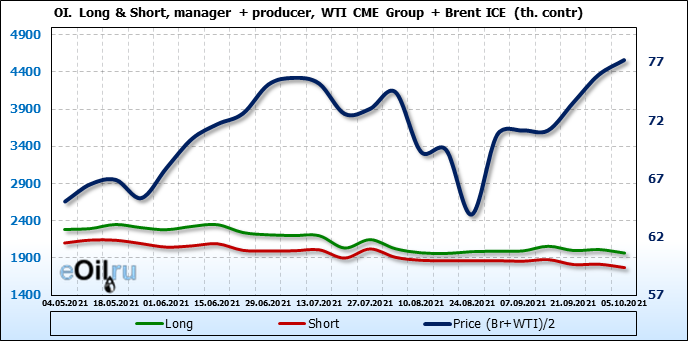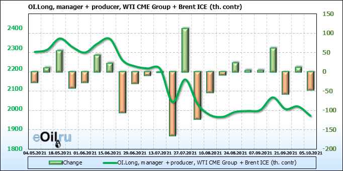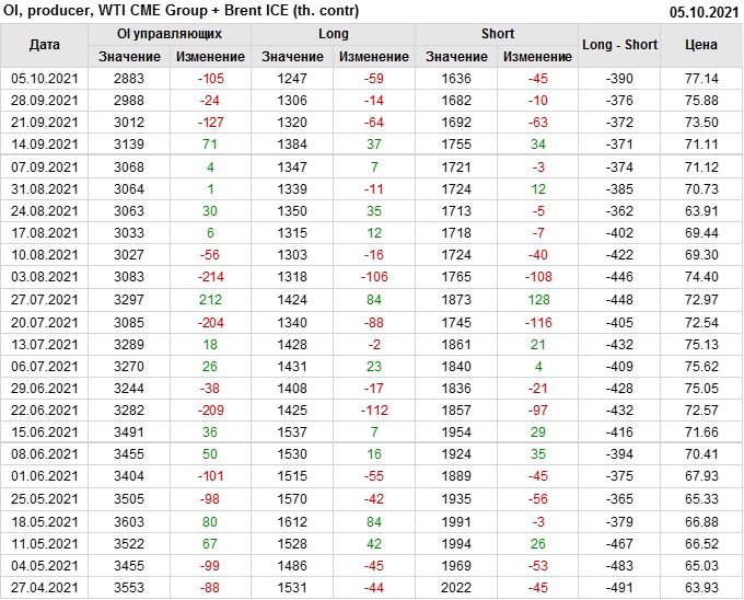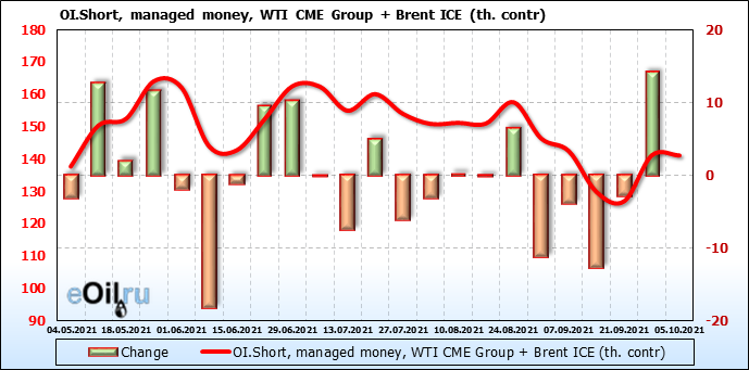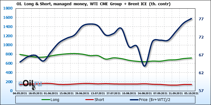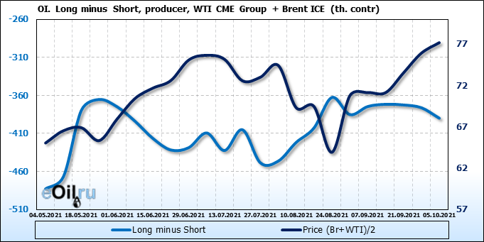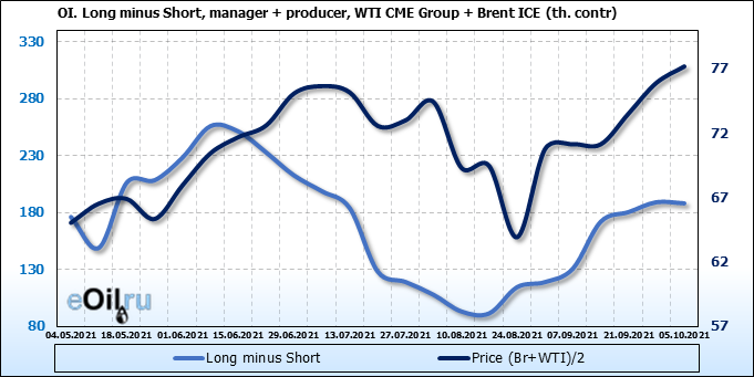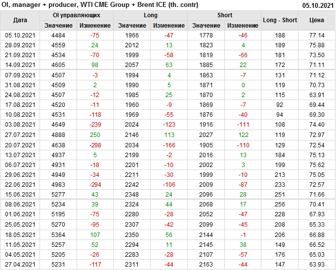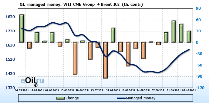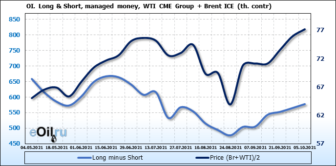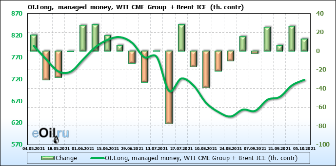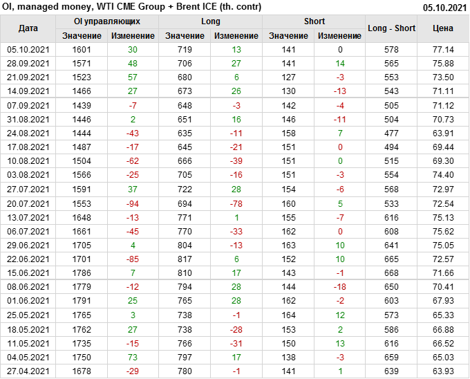 За прошлую неделю, 29.09.21 — 05.10.21, разница между длинными и короткими позициями управляющих увеличилась на 12.8 тыс. контрактов. В тоже время, цена выросла на 1.26 доллара.