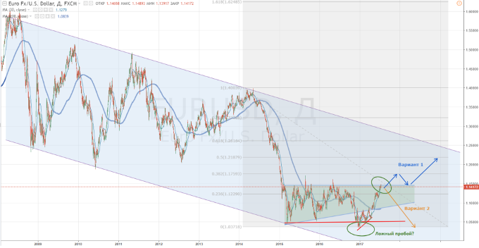 Пара евро/доллар торгуется в определенном нисходящем коридоре с 2008 г. В начале 2015 г. она коснулась нижней границы и сейчас достигла середины канала. Кроме того, паре удалось закрепиться выше 200-дневной скользящей, что перевело ее из медвежьего в бычий тренд.