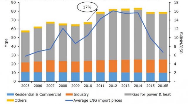 Несмотря на низкий рост спроса на природный газ в жилом секторе, спрос на природный газ, применяемый для генерации энергии, увеличился, что повлекло повышение показателей импорта сжиженного природного газа.  За два года показатель импорта сжиженного природного газа увеличился на 27%. В 2010 году он составлял 70 mtpa, а в 2012 — уже 87 mtpa. За этот же промежуток времени, средний показатель цен на импортный сжиженный природный газ в Японии возрос с 10.5 USD/MMBtu в 2010 году до 16.1 USD/MMBtu в 2012 году. При этом, стоимость нефти марки Brent за тот же период возросла с US$80/bbl до US$111/bbl. Максимального значения показатель объема импорта сжиженного природного газа в Японии достиг в 2014 году и составил 89 mtpa. В 2015 году в стране начали возобновляться работы на АЭС, из-за чего показатель импорта сжиженного природного газа снизился.