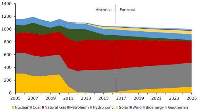 Согласно долгосрочному прогнозу спроса и предложения в секторе энергетики, составленному правительством Японии, к 2030 году 22-24% электричества будет производиться за счет возобновляемых источников энергии. Для сравнения — в 2016 году этот показатель составил 13.5%. Стратегия правительства также предусматривает, что в 2030 году 20-22% электроэнергии будет производиться за счет атомной энергии. Необходимо отметить, что возобновление работ на японских АЭС встречает резкое сопротивление со стороны политической оппозиции. Любые задержки в возобновлении работ на АЭС увеличат зависимость Японии от поставок сжиженного природного газа, угля и возобновляемых источников энергии. Для Японии было бы идеально, если бы пробел в объемах генерации электроэнергии был замещен возобновляемыми источниками энергии. Но из соображений экономии, более выгодным ресурсом может оказаться сжиженный природный газ.