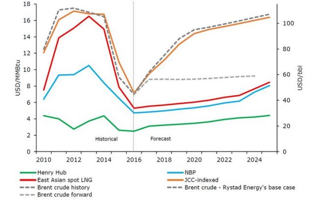 Аналитики полагают, что к 2025 году цена на нефть марки Brent может достичь 107 USD за баррель. Это является эквивалентом долгосрочным контрактам на поставку сжиженного природного газа в размере 16 USD/MMBtu. К 2025 году ожидается что цены Henry Hub будут варьироваться между 3 и 5 USD/MMBtu. Спотовые цены на азиатский сжиженный природный газ будут оставаться на низком уровне вплоть до 2020-ых годов из-за перенасыщения рынка. К 2020 году ожидается перебалансировка рынка. В этот период понадобится освоение новых проектов, так как мировые запасы природного газа начнут сокращаться.