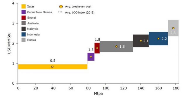 Ожидается, что Катар будет играть ключевую роль в формировании спотового рынка сжиженного природного газа в Японии. На рисунке 7 показаны краткосрочные предельные издержки различных поставщиков сжиженного природного газа в 2016 году. Краткосрочные предельные издержки включают все переменные затраты, связанные с эксплуатацией объектов, а также роялти. Стоимость транспортировки не учитывается.