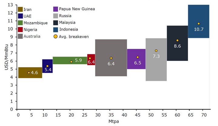 В середине 2020-х годов Японии могут понадобится дополнительные источники сжиженного природного газа, так как истечет срок действия нынешних контрактов на поставку СПГ. Японские покупатели определенно предпочтут экспортеров, способных предложить гибкие краткосрочные контракты. Это означает, что страны с минимальными производственными затратами и большими запасами будут иметь конкурентное преимущество. На настоящий момент страной с минимальной ценой безубыточности является Иран. Цена безубыточности — это цена, при которой поставщик находится в ситуации равенства издержек и доходов. Она равняется минимальным средним совокупным издержкам (постоянным и переменным). При ее расчете не учитываются расходы на транспортировку. В любом случае, вопрос поставки сжиженного природного газа из Ирана в Японию зависит от того, насколько быстро будут разрабатываться и развиваться проекты по производству сжиженного природного газа.