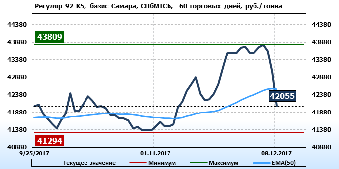 Цены на бензин Регуляр-92 класс 5, базис поставки Самара, торгуемые на СПбМТСБ, упали за неделю на 1 535 рублей до 42 055 рублей за тонну. Тренд на рынке бензина Регуляр-92-К5 на СПбМТСБ, базис поставки Самара, падающий.