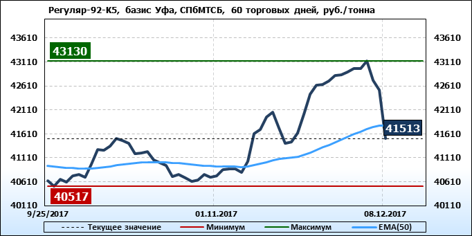 Цены на бензин Регуляр-92 класс 5, базис поставки Уфа, торгуемые на СПбМТСБ, упали за неделю на 1 467 рублей до 41 513 рубля за тонну. Тренд на рынке бензина Регуляр-92-К5 на СпбМТСБ, базис поставки Уфа, направлен вниз.