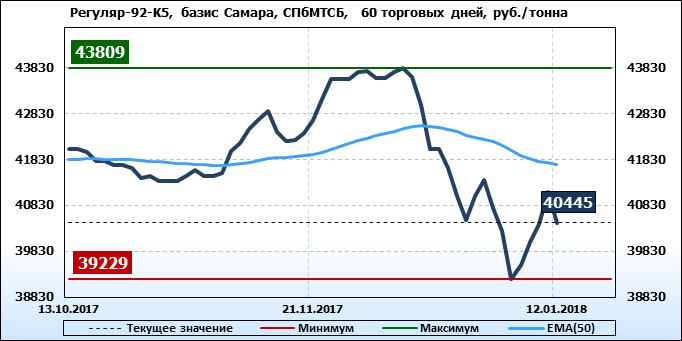 Цены на бензин Регуляр-92 класс 5, базис поставки Самара, торгуемые на СПбМТСБ, выросли за неделю на 1 216 рублей до 40 445 рублей за тонну. Тренд на рынке бензина Регуляр-92-К5 на СПбМТСБ, базис поставки Самара, падающий.