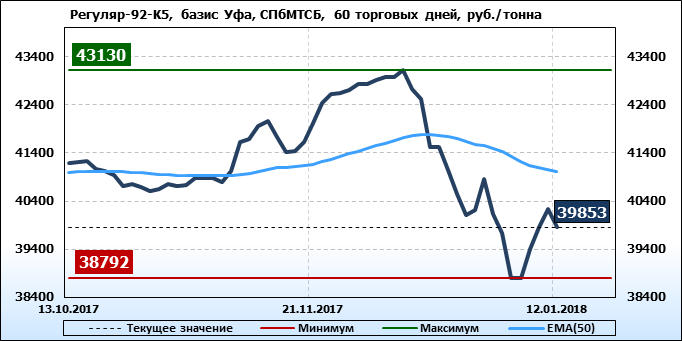 Цены на бензин Регуляр-92 класс 5, базис поставки Уфа, торгуемые на СПбМТСБ, выросли за неделю на 1 061 рубля до 39 853 рубля за тонну. Тренд на рынке бензина Регуляр-92-К5 на СпбМТСБ, базис поставки Уфа, направлен вниз.