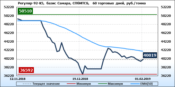 Цены на бензин Регуляр-92 класс 5, базис поставки Самара, торгуемые на СПбМТСБ, упали за неделю на 660 рублей до 40019 рублей за тонну. Тренд на рынке бензина Регуляр-92-К5 на СПбМТСБ, базис поставки Самара, падающий.