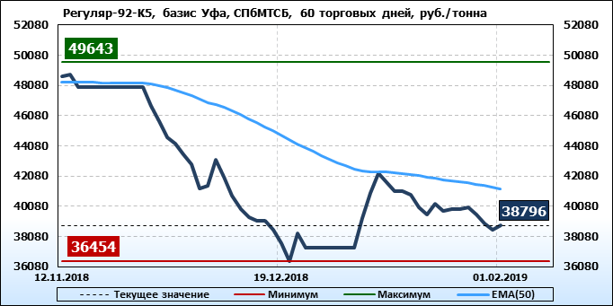 Цены на бензин Регуляр-92 класс 5, базис поставки Уфа, торгуемые на СПбМТСБ, упали за неделю на 1104 рубля до 38796 рублей за тонну. Тренд на рынке бензина Регуляр-92-К5 на СпбМТСБ, базис поставки Уфа, направлен вниз.