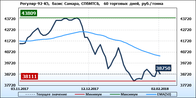 Цены на бензин Регуляр-92 класс 5, базис поставки Самара, торгуемые на СПбМТСБ, упали за неделю на 431 рубль до 38 750 рублей за тонну. Тренд на рынке бензина Регуляр-92-К5 на СПбМТСБ, базис поставки Самара, падающий.
