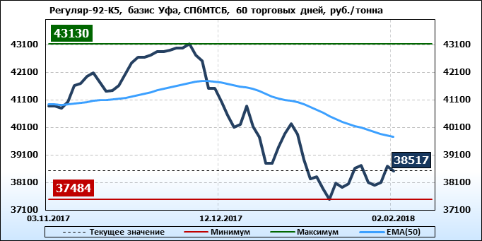 Цены на бензин Регуляр-92 класс 5, базис поставки Уфа, торгуемые на СПбМТСБ, упали за неделю на 203 рубля до 38 517 рублей за тонну. Тренд на рынке бензина Регуляр-92-К5 на СпбМТСБ, базис поставки Уфа, направлен вниз.