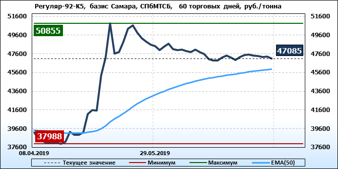 Цены на бензин Регуляр-92 класс 5, базис поставки Самара, торгуемые на СПбМТСБ, упали за неделю на 426 рублей до 47085 рублей за тонну. Тренд на рынке бензина Регуляр-92-К5 на СПбМТСБ, базис поставки Самара, растущий.