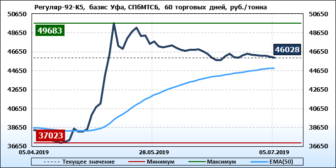 Цены на бензин Регуляр-92 класс 5, базис поставки Уфа, торгуемые на СПбМТСБ, упали за неделю на 337 рублей до 46028 рублей за тонну. Тренд на рынке бензина Регуляр-92-К5 на СпбМТСБ, базис поставки Уфа, направлен вверх.