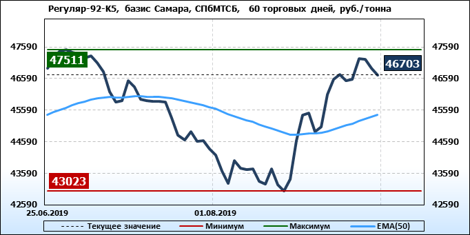 Цены на бензин Регуляр-92 класс 5, базис поставки Самара, торгуемые на СПбМТСБ, выросли за неделю на 168 рублей до 46703 рубля за тонну. Тренд на рынке бензина Регуляр-92-К5 на СПбМТСБ, базис поставки Самара, растущий.