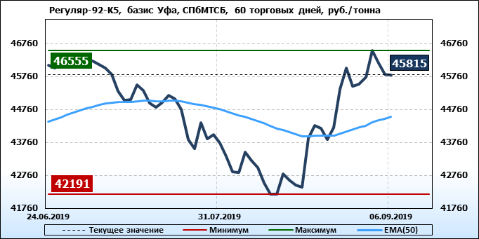 Цены на бензин Регуляр-92 класс 5, базис поставки Уфа, торгуемые на СПбМТСБ, выросли за неделю на 275 рублей до 45815 рублей за тонну. Тренд на рынке бензина Регуляр-92-К5 на СпбМТСБ, базис поставки Уфа, направлен вверх.