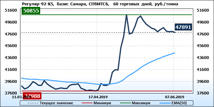 Цены на бензин Регуляр-92 класс 5, базис поставки Самара, торгуемые на СПбМТСБ, упали за неделю на 462 рубля до 47891 рубля за тонну. Тренд на рынке бензина Регуляр-92-К5 на СПбМТСБ, базис поставки Самара, растущий.