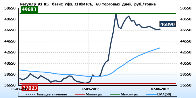 Цены на бензин Регуляр-92 класс 5, базис поставки Уфа, торгуемые на СПбМТСБ, упали за неделю на 338 рублей до 46890 рубля за тонну. Тренд на рынке бензина Регуляр-92-К5 на СпбМТСБ, базис поставки Уфа, направлен вверх.