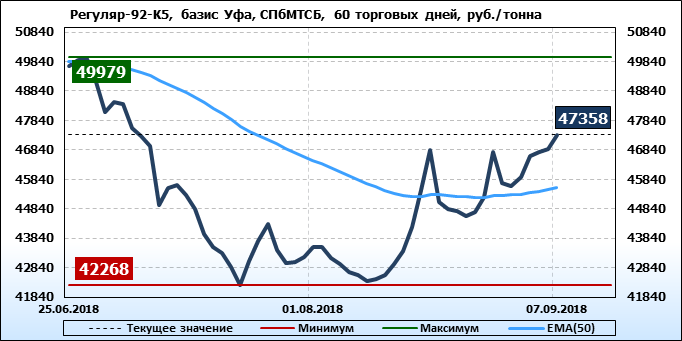 Цены на бензин Регуляр-92 класс 5, базис поставки Уфа, торгуемые на СПбМТСБ, выросли за неделю на 1755 рублей до 47358 рублей за тонну. Тренд на рынке бензина Регуляр-92-К5 на СпбМТСБ, базис поставки Уфа, направлен вверх.
