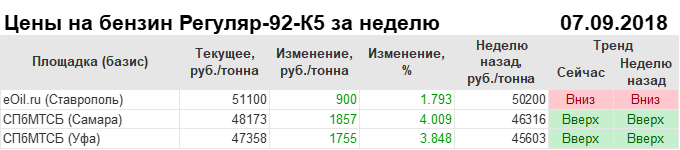 Цены на бензин. Р-92-К5, базис Ставрополь, ЭТП eOil.ru. Данные на 07.09.2018