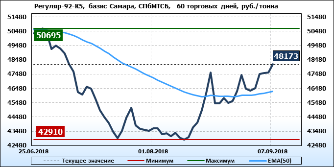 Цены на бензин Регуляр-92 класс 5, базис поставки Уфа, торгуемые на СПбМТСБ, выросли за неделю на 1755 рублей до 47358 рублей за тонну. Тренд на рынке бензина Регуляр-92-К5 на СпбМТСБ, базис поставки Уфа, направлен вверх.