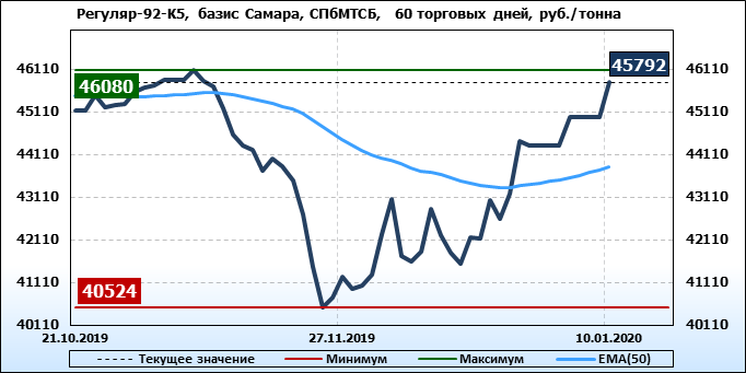 Цены на бензин Регуляр-92 класс 5, базис поставки Самара, торгуемые на СПбМТСБ, выросли за неделю на 1473 рубля до 45792 рубля за тонну. Тренд на рынке бензина Регуляр-92-К5 на СПбМТСБ, базис поставки Самара, растущий.