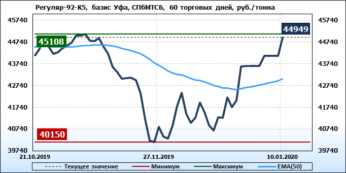 Цены на бензин Регуляр-92 класс 5, базис поставки Уфа, торгуемые на СПбМТСБ, выросли за неделю на 1313 рубля до 44949 рублей за тонну. Тренд на рынке бензина Регуляр-92-К5 на СпбМТСБ, базис поставки Уфа, направлен вверх.