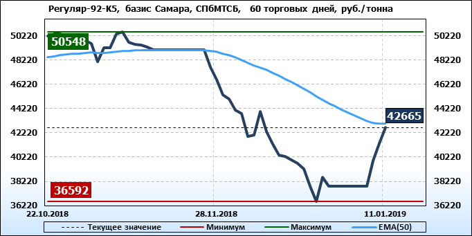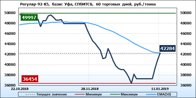 Цены на бензин Регуляр-92 класс 5, базис поставки Уфа, торгуемые на СПбМТСБ, выросли за неделю на 4945 рублей до 42284 рубля за тонну. Тренд на рынке бензина Регуляр-92-К5 на СпбМТСБ, базис поставки Уфа, направлен вниз.
