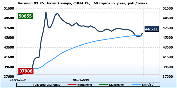 Цены на бензин Регуляр-92 класс 5, базис поставки Самара, торгуемые на СПбМТСБ, упали за неделю на 554 рубля до 46531 рубля за тонну. Тренд на рынке бензина Регуляр-92-К5 на СПбМТСБ, базис поставки Самара, растущий.