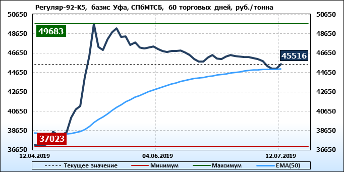 Цены на бензин Регуляр-92 класс 5, базис поставки Уфа, торгуемые на СПбМТСБ, упали за неделю на 512 рубля до 45516 рублей за тонну. Тренд на рынке бензина Регуляр-92-К5 на СпбМТСБ, базис поставки Уфа, направлен вверх.