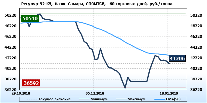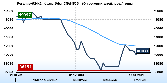 Цены на бензин Регуляр-92 класс 5, базис поставки Уфа, торгуемые на СПбМТСБ, упали за неделю на 2263 рубля до 40021 рубля за тонну. Тренд на рынке бензина Регуляр-92-К5 на СпбМТСБ, базис поставки Уфа, направлен вниз.